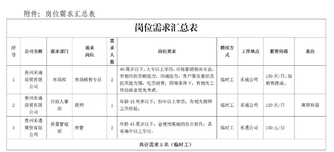 拟向社会招聘市场专员临时工2、食堂厨师1人(离职补招)、库管2人(详见附件)。