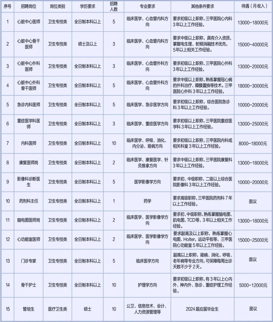 目前医院处于快速上升发展阶段,依据临床科室发展需要,向社会公开招聘人员情况如下: