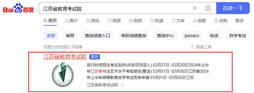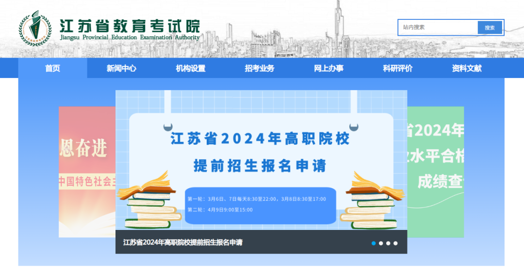 考生登录江苏省教育考试院官网(http://www.jseea.cn/),或在搜索引擎中输入“江苏省教育考试院”,点击带有“官方”标识的网站。