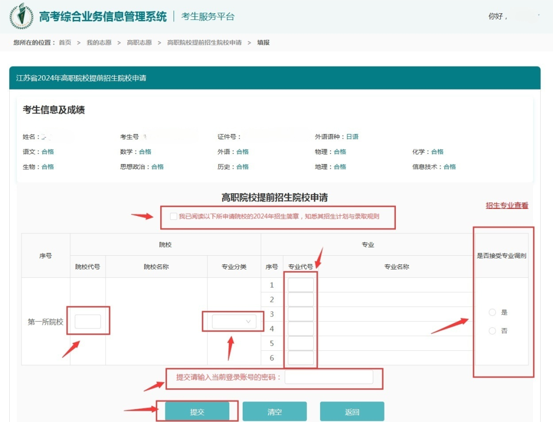 点击“删除已申请院校”删除院校志愿,从新填写新的院校信息即可!