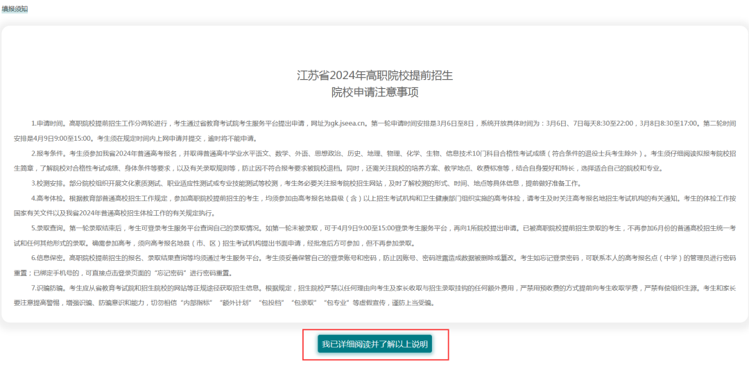 进入志愿填报页面前会有一个志愿填报注意事项,请考生阅读后点击同意,进入志愿填报页面。