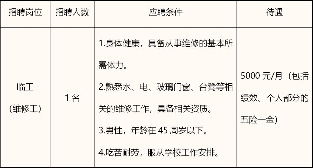 因学校工作的需要,现面向社会招聘临工(维修工),招聘岗位及具体要求如下: