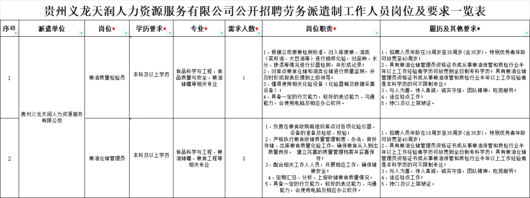 附件1:贵州义龙天润人力资源服务有限公司公开招聘劳务派遣制工作人员岗位及要求一览表.xls