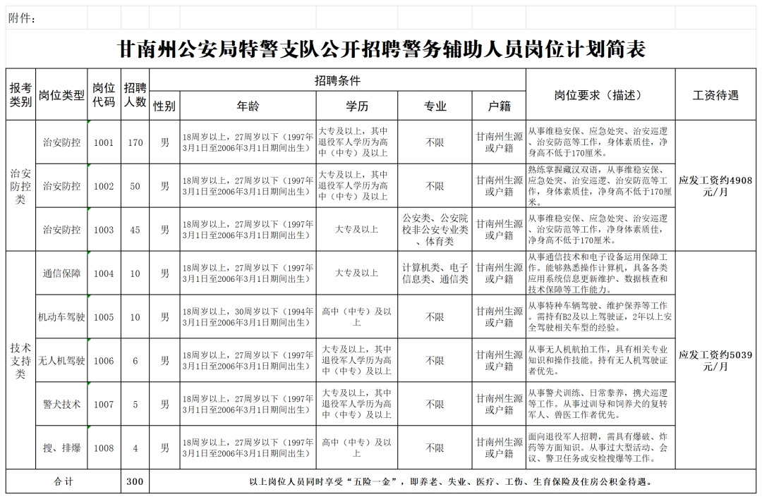 计划共招聘警务辅助人员300名(详见《岗位计划简表》)。鉴于公安特警工作高风险、高强度、强应急的职业特点和实行全封闭、军事化集中训练管理的要求,仅限招聘男性人员。