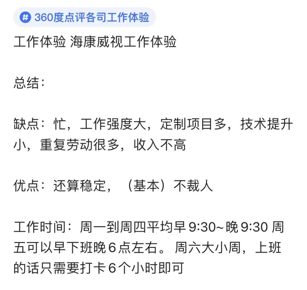 海康威视,这个名字或许对一些人来说并不熟悉,但它的技术实力却得到了国际认可,尤其是在被美国政府列入贸易黑名单之后,其实力更是被众多人所关注。正如俗话所说,非凡的能力往往会引起强者的注视,海康威视正是这样一个例子。 当我们谈论起监控设备,很多人的第一反应就是海康威视。即便是面对国际巨大的压力,这家公司依然坚定不移。作为一个拥有六万员工的上市公司,自2001年成立以来,海康威视始终专注于技术创新,经过二十多年的努力,在安防及智能物联网领域取得了令人瞩目的成就。 身为制造业的佼佼者,海康威视对人才的渴求永远都在。但在这样一家优秀的企业工作,会是一种怎样的体验呢? 最近,一位在海康威视工作的员工分享了他的亲身经历。他表示,海康威视最大的优点就是工作的稳定性,公司很少进行裁员。但是,如果员工的绩效表现不佳,就需要面对被优化的压力。 对于刚加入海康威视的新员工而言,起始的薪酬待遇相当不错,月薪约为15000元,年终还会有15个月薪水的奖励。除此之外,公司还提供各种补贴,包括餐饮、交通和通讯补助,这些补助一年大约能达到1万元以上。更令人鼓舞的是,随着在公司的时间增长,每年都会有薪资的普遍调整。 在海康威视,福利待遇方面或许不算丰厚,公司平均每季组织一次团建活动,不过这些活动通常安排在周六进行。工作日晚上10点后,公司会提供免费打车服务,但是没有提供零食或下午茶。节假日公司会发放一些礼品,虽然价值不大。对于出差的补助,每天90元,这在某些情况下可能显得不够充足。 谈及工作时间,周一至周四的日常工作安排是早上9点半至晚上9点半,周五则可以早些离开,大约在晚上6点左右。周六通常实行大小周制度,若需上班,只需工作6小时。午餐和晚餐时间加休息总计各占1.5小时。尽管工作时间相对固定,突发事件较少,导致加班并不频繁,一年中加班至深夜的情况可能只有几次。 海康威视的工作内容多样,其中定制项目、维修任务以及物料转换项目占据了大量时间和精力。比例上,定制项目与基线项目的比例约为2:1。偶尔能参与预研或全新项目,对员工来说是一个幸运的机遇。然而,海康的日常工作强度相当高,杂务繁多,尤其是生产线出现的问题和客户反馈的问题最为耗费精神。 常常忙碌一整天,当计划进行文档编写或绘制原理图时,发现时间已经是晚上8点半。虽然海康的技术层面评价一般,但公司内部定期举行的技术分享对新员工的成长颇为有益,项目流程和设计规范性在行业内保持较高水平。 总结而言,海康威视的挑战在于高强度的工作压力、众多的定制项目、有限的技术成长空间以及重复性工作的多样性,这些因素共同影响着员工的工作体验和个人发展。 对于那些刚刚踏入职场的新人来说,海康威视无疑是一块绝佳的试金石。在这里,他们能够迅速适应职场环境,学习如何在工作中游刃有余。 相较于那些互联网巨头,海康威视的薪资或许不算顶尖,但在传统制造行业中却已处于较高水平。虽然工作量大,但由于技术门槛不高,新手可以较快上手,不必过分担心技术上的挑战。 诚然,世上没有既轻松又赚钱的好工作。正如古话所说,无付出,无收获。每个人的努力都会在某个时刻得到相应的回报。 我们都梦想着找到一份既轻松又有发展潜力、薪水优厚的工作,然而现实往往与理想有差距。因此,不妨放下架子,从基层做起,一步步踏实前行。机遇总是倾向于那些准备充分,而非空想的人。 在这个充满机遇的春季,愿每位寻求职场发展的朋友都能找到心仪的工作,实现年薪百万的梦想。 |