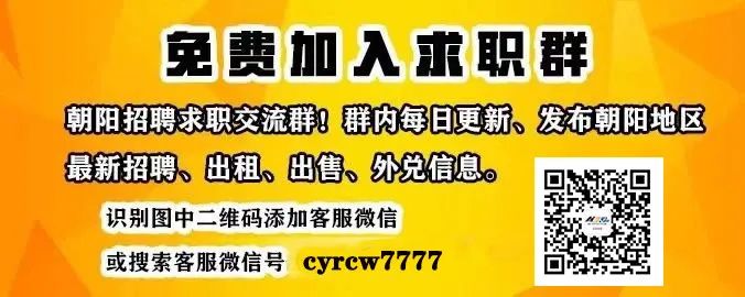 联系时请说明是在朝阳人才网看到的更多招聘信息请关注朝阳人才网公众号,三万多份求职简历,几百家招聘单位供你选择。还有免费区让你发布招聘信息,更多惊喜等着你!!!