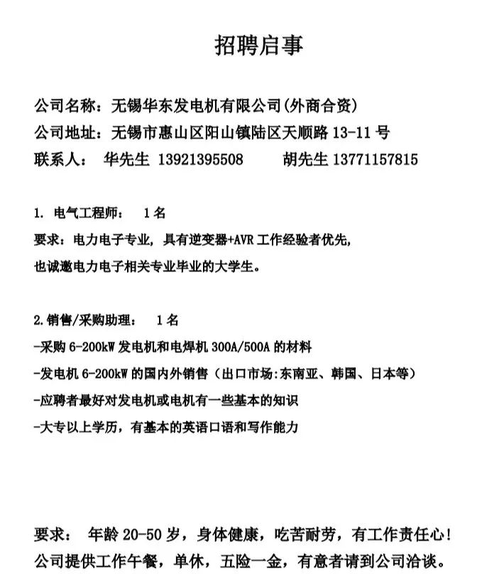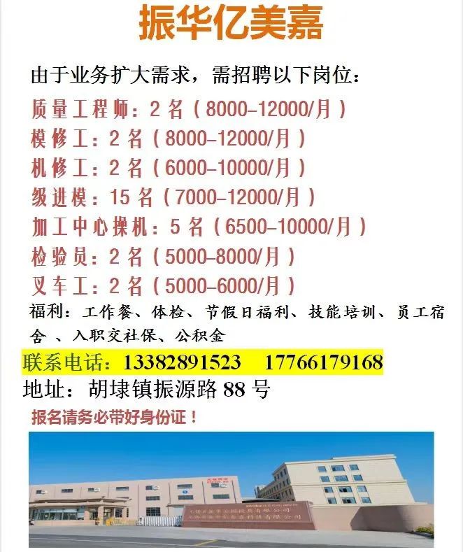 ⛔️联系时请说在萌鸭上看到的(3.20) 【招聘】无锡四季红铝业招聘 ✅铝焊工2名 ✅安装工3名,安装门、围栏 ✅普工2名 ✅喷头工2名 单休,7:30~16:30,待遇面谈 ☎️联系方式:18862233623韩 🕹️地址:松芝村附近 ⛔️联系时请说在萌鸭上看到的(3.21) 【招聘】无锡市昊洋电器有限公司诚聘 女工数名,计件工资,18-45周岁,工资4000-6500/月 地址:杨市火炬村 电话:邹先生15152253660 ⛔️联系时请说在萌鸭上看到的(4.2) 【招聘】鸿鹄纺织招经理助理,文员,女,25~35岁,吃苦耐劳,岁数适当可以放宽一些 ,看实际能力下来可以做业务业务有提成,做六休一,交社保,有饭贴,薪资面谈 联系电话:13861878887 联系地址:惠山区洛社镇石塘湾秦巷(中桥1号) ⛔️联系时请说在萌鸭上看到的(3.24) 【招聘】诚聘快递员、操作工、分拣工数名 要求:工作认真负责,薪资面议,有意者联系 联系方式:18706182925 工作地址:钱桥藕塘 ⛔️联系时请说在萌鸭上看到的(3.20) 【招聘】胡埭:无锡新隆东机械有限公司招检验一名 ,要求会识图,简单办公软件,工资面议,欢迎电话咨询。 ❤️地址:胡埭马鞍村前吴巷59号 ❤️联系人:吴13584245640 ⛔️联系时请说在萌鸭上看到的(3.20) 【招聘】 1、数控车师傅,工资9000-12000(会编程 独立操作); 2、数控外圆磨师傅,工资9000-12000(熟练工); 3、无心抛光师傅,工资240-300/天(熟练工); 4、包装工/辅助工2名,工资180-200/天。 联系电话:李先生15672816399 公司地址:滨湖区胡埭镇景天路11号(西溪路23号) ⛔️联系时请说在萌鸭上看到的(3.9) 【招聘】无锡市凯珑通用零部件制造有限公司诚聘 ✅操作工5名,能吃苦耐劳,接受加班,眼睛好,45岁以内,4000~7000/月 ✅仓管1名,男女不限,薪资4000-7000 ✅业务文员1名,薪资4000-7000 联系地址:杨市杨阳路10号 联系电话:13395130808 ⛔️联系时请说在萌鸭上看到的(3.21) 【招聘】江苏上福新材料科技有限公司诚聘 ✅电工,机修维修,5000~7000元/月 ✅销售员,五险一金 ,双休 做过食包材的优先,4500元/月+提成 ✅包装工、操作工数名,12小时两班倒,5000~7000元/月,有加班工资 ✅仓管,有叉车证的优先,5000~7000元/月 联系电话:13921127741 地址:陆区陆戴路68号 ⛔️联系时请说在萌鸭上看到的(5.28) 【招 聘 启 事】 公司因扩大生产,需要向社会招聘办公室业助2名(要会电脑和基础的EXcel) 要求:1.年龄40岁以下,工作细心,有工作经验的优先。 2. 年工资税后5-6万左右 3. 交五险,提供工作餐 工作时间: 8小时单休长白班 联系电话:18961713765 秦小姐 地址:厚桥街道中东村村委旁 无 锡 市 亿 发 纸 业 2024年2月20日 ⛔️联系时请说在萌鸭上看到的(3.20) 【招聘】金融科技公司诚招以下岗位: 1、金融顾问 2、养老管家 3、家庭医生 ✅工资:保底3000上不封顶,医疗养老保险都有 ✅要求:大专以上 🏠公司地址:深港天地 ☎️联系电话:13585048461 ⛔️联系时请说在萌鸭上看到的(3.18) 【招聘】💯钱🐇无量—2024新年大吉\招聘信息📲 15061785944📢大量要人,都可以安排!不忌口的少数民族大量收散户批量都可以!男女不限16-55文化不限,民族不限! 🔱后宅_塑料厂:男女18-48 模式一:七天后日结日结。白班210夜班220压七天以后日结,工期三个月,中介所提成30/天。提一个月! 模式二:周结、220一天,工资压7天后每周五发上周工资,工期三个月。 厂车路线: 春潮:春潮一区、花样年华、香溢紫郡、富力城、嘉悦大厦方向有厂车; 梅村:6:35联心嘉园,6:40梅村老街,6:45梅荆花苑三区,6:50太阳城(上海华联) 硕放:南星苑(欧德福超市),7:10嘉华医院,7:15中国银行,7:20南星苑(欧德福超市) 要求:男女18-48修毛刺,两班倒,不穿不看,白班两顿免费工作餐夜班一顿免费工作餐、免费住宿。保险75/月,水电费平摊! 🔱安镇长白班男女18-45岁,8:00—8:00,200一天,简单手工活,不穿不看包吃住,车间干净,管理超级松,留人100% ,生产电动车小尾灯,直接看活安排住宿上班, 🔱羊尖塑料厂:男女16—55岁,白班200,夜班210,不体检不面试,直接看活安排住宿上班,可预支,部分长白班岗位, 🔱羊尖_包装厂:男女16-50白班200夜班210(不管饭额外饭补10/顿,一天两顿补贴20)提供住宿,不要体检,民族不限,大量要人。每周可预支。 🔱硕放_塑料厂:男女18- 50白班200夜班210提供工作餐,提供住宿,辅助工修毛边,上下班交通自理,不要体检看过车间一经录用直接上班。可预支。 🔱安镇线束厂:长白班男女20-40,210一天,另两顿餐补18,名族学历不限,8:00到21:00, 18761519191(全天可面试) ⛔️联系时请说在萌鸭上看到的(3.17) 【招聘】莱克酒店诚聘客房保洁数名、女性、学历不限、工作环境好,有工作餐。要求具有责任感,能吃苦耐劳,待遇面议! 地址:惠山区高力汽博城32栋 招聘热线:13616188167 ⛔️联系时请说在萌鸭上看到的(3.18) 【招聘】 因本工厂长期稳定发展,扩大产能,现招聘以下岗位: 电子装配员:5名半成品装配员:5名检验员:3名检测员:3名杂活:1名 1、职位要求:25-50岁,杂活50-60岁,女性优先,经验不限。 2、薪资福利:购买社保五金,有工作餐,工龄奖、绩效奖、年终奖金等,工资具体面谈。 3、工作时间:长白班7:30-17:00 4、环境舒适干净,坐班,车间内设冷暖空调,产品轻小,手工操作,工作简单,易学易操作。 滨湖区申成工量具厂欢迎您的加入! 地址:雪浪街道南泉裕村尚库桥下豪普厂区内联系人:陆女士 杨女士 联系电话:13382222600 13632597641 ⛔️联系时请说在萌鸭上看到的(3.24) 【招工启示】本公司招聘:文