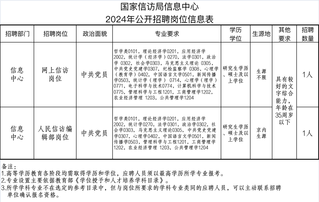 ![]() 国家信访局信息中心2024年公开招聘应届毕业生公告根据工作需要,按照《事业单位人事管理条例》和事业单位公开招聘有关政策规定,国家信访局信息中心2024年度面向应届毕业生公开招聘工作人员2名。现将有关具体事项公告如下。 一、单位介绍及招聘岗位 国家信访局信息中心是国家信访局直属事业单位,位于北京市西城区月坛南街8号。主要职责是,负责组织全国信访系统信息化规划、标准的制定和实施,负责编辑、出版、发行《人民信访》,负责为网上信访业务提供工作支撑等。具体招聘岗位见附件1。 二、招聘原则 坚持公平、公正、公开的原则,采取考试与考察相结合的方式择优聘用。 三、招聘对象 招聘对象须为2024年应届毕业生(不含各类委培生、定向生、部队院校学生),一般应在2024年7月底前毕业并取得相应的学历学位证书。应聘人员在校期间所修课程全部合格。 四、应聘人员资格条件 (一)具有中华人民共和国国籍,拥护中华人民共和国宪法和法律法规,拥护中国共产党领导和社会主义制度,品行端正,遵纪守法。 (二)政治立场坚定,增强“四个意识”、坚定“四个自信”、做到“两个维护”,热爱中国共产党、热爱祖国、热爱人民。有志于党的信访事业。 (三)具有较强的事业心和责任感,爱岗敬业,具有良好的奉献精神和团队协作精神。 (四)年龄要求: 年满18周岁,且不超过35周岁(1989年1月1日以后出生)。京外生源符合在京就业落户有关规定;京内生源应在入读高校前具有北京市常住户口(不含北京高校集体户口)。 (五)具有正常履职的身体条件和心理素质。 (六)符合岗位所需要的其他资格条件。 具有下列情形之一的,不得报考: 1.因犯罪受过刑事处罚的、被开除中国共产党党籍的或被开除公职的。 2.涉嫌违纪违法正接受有关机关审查调查尚未有结论的。 3.受过学校或院系处分的。 4.被依法列为失信联合惩戒对象的。 5.在各级公职人员招考中被认定有舞弊等严重违反考试录用纪律行为(含在影响期内)的。 6.法律、法规规定不得聘为事业单位工作人员等其他情形。 应聘人员不得报考聘用后即构成回避关系的招聘岗位。 五、招聘程序 (一)公开报名。 1.报名时间:即日起至2024年3月17日(周日),逾期不予受理。 2.报名方式:登录国家信访局官网下载并准确填写《国家信访局信息中心2024年度公开招聘工作人员报名表》(附件2),将填写好的电子版报名表和个人简历,以“招聘岗位+姓名”为邮件主题及附件名,。每人限报1个岗位。 (二)资格审查。 对报名人员进行资格初审,通过资格初审的人员,将以电子邮件方式通知。待收到初审通过的邮件回复后,将打印好已签字的纸质《报名表》,与本人身份证、户口簿(首页及本人页)、个人简历、已获得的学历学位证书、加盖教务部门公章的成绩单、就业推荐表、奖励证明材料等(上述所有材料均只需提供复印件),于报名截止时间之前(以邮戳为准)以邮政特快专递形式寄至北京市1706信箱国家信访局人事司人事一处。未通过资格审查者不再另行通知。对寄送材料人员进行资格复审,通过审查的报名人数不足3:1的,取消该岗位招聘计划,并在国家信访局网站上公布。上述材料除本人要求外一般不再退回。 资格审查贯穿整个招聘工作,在各环节发现应聘者不符合报考资格条件的,均可取消其考试或聘用资格。 (三)笔试。通过资格审查的人员参加笔试,时间另行通知,笔试地点在北京市。具体时间、地点和有关事项将以电子邮件方式通知,需本人回复确认参加笔试。在笔试现场告知考生笔试合格分数线的划定规则。 (四)面试。达到笔试合格分数线的考生,按照成绩由高到低的顺序,以各招聘岗位1:5的比例差额确定参加面试人选。如有放弃面试资格的,按笔试成绩从高到低的顺序递补。面试前,考生应携带报名时提交的材料原件以供资格复审。 (五)确定人选。按照笔试、面试成绩分别占40%、60%的比例合并计算综合成绩,按照1:2的比例差额确定体检和考察人选。 (六)体检和考察。体检参照公务员录用标准进行,费用由用人单位承担。体检考察不合格、自愿放弃或其他原因不符合聘用条件的,取消其聘用资格。因考生自愿放弃、体检或考察不合格等原因产生的岗位候选人空缺,经用人单位研究,可按综合成绩由高到低的顺序依次递补,也可不再递补。考察时,一般到考察对象所在学校进行考察,采取实地走访、个别谈话、审核人事档案(学籍档案)、查询社会信用记录、同本人面谈等方法,了解考察人选政治素质、道德品质、能力素质、心理素质、学习和工作表现、遵纪守法、廉洁自律、岗位匹配度等情况。必要时进行延伸考察。考察对象在国家信访局有亲属关系和主要社会关系的,考察前须主动报告。 (七)公示。根据应聘人员的考试综合成绩、体检结果和考察情况等,确定拟聘用人员,并在国家信访局官网和人力资源社会保障部“中央国家机关所属事业单位公开招聘服务平台”进行公示,公示期为7个工作日。 (八)聘用。公示期满无问题的,按规定办理相关聘用手续。公开招聘实行试用期制度,期满考核合格的,予以正式聘用,京外生源办理进京落户手续;考核不合格的,取消聘用。 六、福利待遇 聘用人员享受国家规定的事业单位工作人员工资福利待遇,可视情解决住宿问题。符合要求的京外生源按规定程序落户北京。 