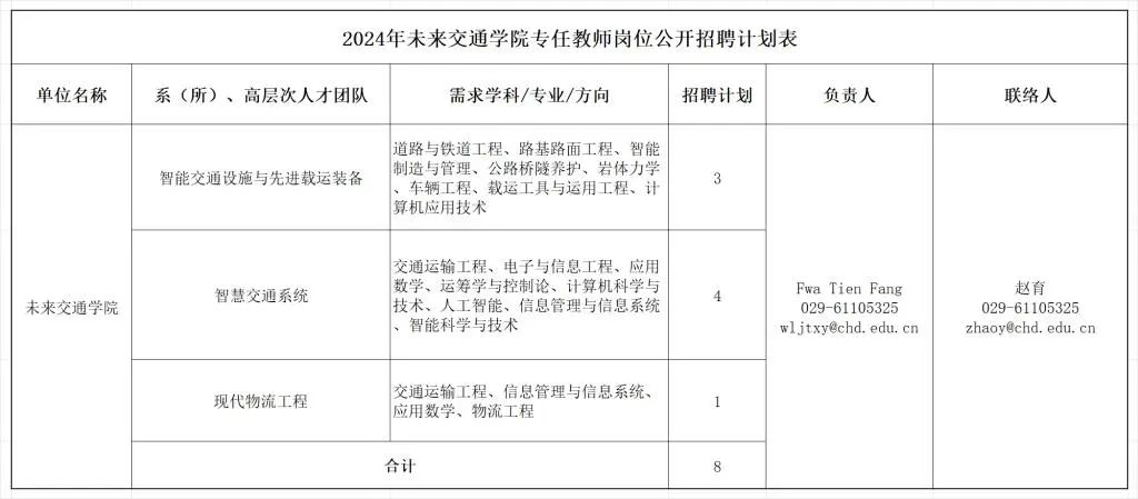 国内高等院校2024年应届毕业或教育部认可留学回国的硕士研究生、博士研究生及非定向出站博士后,其中,硕士研究生毕业时间应为2023年9月1日至2024年8月31日,博士研究生毕业时间应为2023年9月1日至2024年12月31日,非定向出站博士后应未办理出站调动手续且于2024年12月31日前出站。(1)拥护中国共产党的领导,热爱党的教育事业,具有较高的政治素质和坚定的理想信念,坚决贯彻执行党的基本路线和各项方针政策,有较强的政治敏感性和政治辨别力。(2)热爱高等教育事业,落实立德树人根本任务,潜心教书育人,关心爱护学生,恪尽职守,甘于奉献。(3)遵纪守法,诚实守信,公道正派,廉洁自律,身心健康,具备工作岗位所必需的身体素质和心理素质。(1)掌握基本的教学理念和教学方法,教学态度端正,能承担课程的讲授工作;具有扎实的理论基础、渊博的专业知识、良好的科学研究素养,勇于探索,思维创新。(2)年龄:截止2024年7月15日,博士研究生年龄原则上不超过32周岁(1992年7月15日后出生),硕士研究生年龄原则上不超过28周岁(1996年7月15日后出生)。(4)各学习阶段均为统招毕业并获相应的学历学位,应届毕业生能如期取得岗位要求的学历学位。(6)具备专任教师岗位需求的学历学位、学科/专业/方向等条件要求。专任教师实行“准聘-长聘”管理,一般按照3年一个聘期签订聘用合同,准聘期原则上不超过6年,聘期考核合格可转为长聘岗位。来校按“准聘(师资博士后)”聘用并办理进站,受聘人员按专任教师与博士后双重身份管理。应聘人员登录“长安大学招聘网”,申报岗位(职位)、填写报名信息,要求个人信息真实、有效、完整。专任教师岗位报名截止时间为2024年9月30日。(根据报名情况适时择优推荐并组织开展考察工作,专任教师岗位招满即止。请符合公告毕业时间等要求的应聘人员,尽早提交简历并申报岗位。)学院根据应聘条件、岗位要求、任职条件、队伍建设需求及学校有关规定等情况,登录“长安大学招聘网”进行资格初审,择优推荐参加资格复审人员。学院通知初审通过人员补充提交相关材料并复审原件,确定资格审核通过人员。初审或复审未通过人员,由学院在招聘系统统一反馈结果,不予另行通知。学校组织校外同行专家对应聘专任教师岗位人员的思想道德、学术水平及科研成果等综合评价。综合评价通过者,由用人单位组织后续考察工作。学院对应聘人员进行面试、试讲考察、思想政治和师德师风考察、心理测评等。学校根据笔试、面试结果等研究确定拟聘人员,在人事处网站面向社会公示7天(5个工作日),公示无异议或反映的问题不影响聘用的,由学校统一安排入职体检。拟聘人员原则上须在15个工作日内参加入职体检并签订就业协议,逾期视为放弃应聘资格。拟聘人员须在就业协议约定期限内将人事档案转寄我校,同时持所有学历的毕业证、学位证(国(境)外毕业生持教育部留学服务中心开具的《国外学历学位认证书》《留学人员回国工作就业报到证》)、非定向出站博士后持博士后出站介绍信等材料到人事处签订聘用合同、办理报到手续,逾期视为放弃应聘资格。1.应聘人员按要求提交报名应聘资料,未在规定时间内报名、报名资料不完整或不符合规范的报名无效,相关责任由应聘者承担。2.未能在规定时间办理报到事宜的,聘用资格自动取消。3.资格审查贯穿招聘工作全过程。凡有任何作弊行为、提供的材料弄虚作假或不符合我校招聘要求的,无论何时,一经查实,学校将取消其应聘资格直至取消聘用资格,相关责任由应聘者承担。4.应聘人员选择符合自身条件的岗位申报,学校2024年公开招聘的岗位(职位)每人仅限申报1个。5.应聘人员应确保填写有效联系方式(电子邮箱及手机)并在应聘全程保持联系畅通,如因故造成相关信息未能及时送达,后果由应聘人员自行承担。6.招聘全过程应遵守《事业单位人事管理回避规定》有关要求,对于所有应聘者、参与者以及可能影响公正的特定关系人,应主动提出回避申请。
