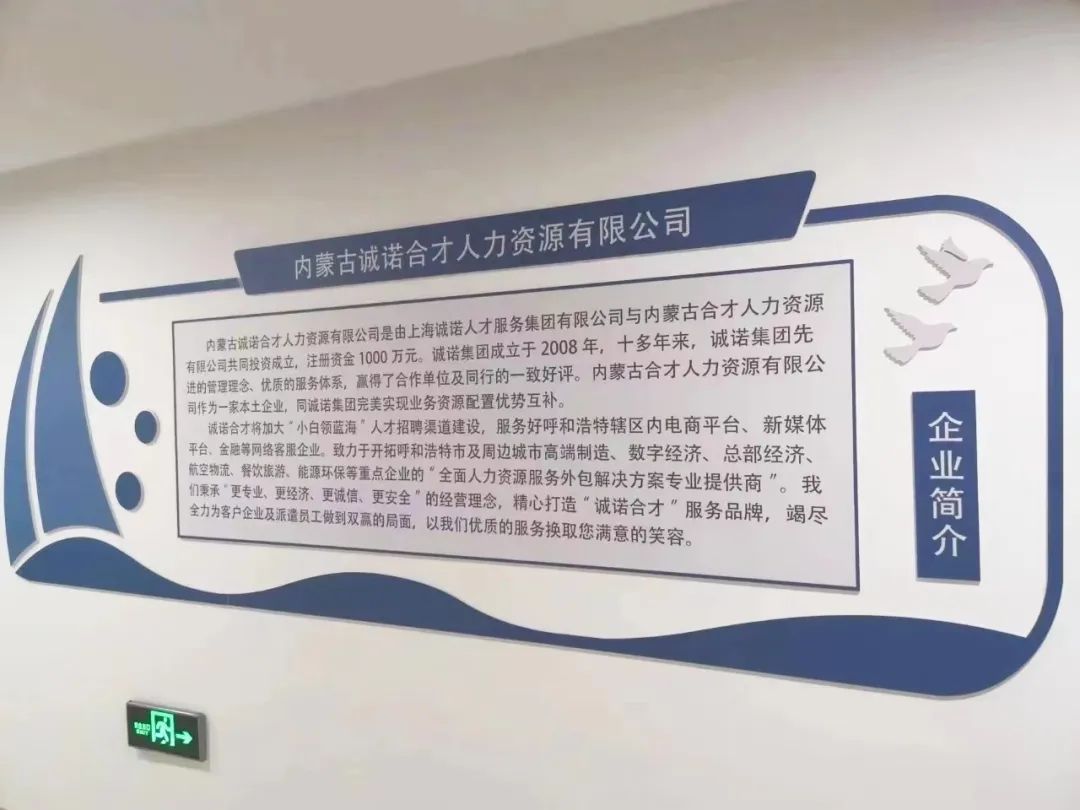 企业介绍: 内蒙古诚诺合才人力资源有限公司(公司简称“诚诺合才”)是由上海诚诺人才服务集团有限公司与内蒙古合才人力资源有限公司共同投资成立,企业位于内蒙古首府呼和浩特市人力资源服务产业园。