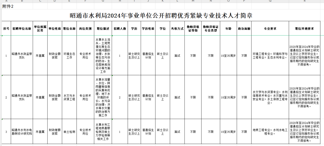 昭通市水利局2024年公开招聘优秀紧缺专业技术人才通告 为引进水利行业优秀紧缺专业技术人才,按照《事业单位公开招聘人员暂行规定》(人社部令6号)、《云南省事业单位公开招聘人员暂行规定》(云人社发〔2016〕182号)和《昭通市2024年事业单位公开招聘优秀紧缺专业人才实施办法》有关规定,经昭通市人力资源和社会保障局批准,昭通市水利局决定面向全国公开招聘事业单位优秀紧缺专业技术人才4名,具体事宜通告如下。 一、招聘原则 坚持公开、公平、竞争、择优的原则;坚持尊重知识、尊重人才、学以致用、专业对口的原则;坚持信息公开、过程公开和结果公开,并接受纪检监察和社会各界监督的原则。 二、招聘条件 (一)报考者应具备以下条件 1.具有中华人民共和国国籍,享有中国公民政治权利。 2.遵纪守法,品行端正,具有艰苦创业、团结协作、诚实守信和为科技事业奉献的精神,服从组织安排。 3.具有岗位所需的学历、专业要求和履职资格条件。 4.普通招生计划近5年(2020年至2024年)毕业的硕士研究生及以上学历毕业生,优先招聘博士学位研究生。 5.年龄在18周岁以上,35周岁以下(1988年8月至2006年8月期间出生)。 6.具备适应岗位要求的身体条件。 7.具有岗位所需要的其他条件。 8.国(境)外毕业生须提供教育部国(境)外学历、学位认证书。 (二)有下列情况之一者不得参加报考 1.现役军人。 2.已签订定向服务协议或服务期内的定向研究生。 3.截止报名时已经录(聘)用为机关事业单位的在职在编人员的。 4.招聘后即构成《事业单位人事管理回避规定》第六条所列回避情形的人员。 5.受到党纪、政纪处分期限未满或者正在接受纪律审查的;正在接受司法调查尚未作出结论的。 6.被开除中国共产党党籍的人员、因犯罪受过刑事处罚的人员、被开除公职的人员、吸毒人员、被依法列为失信联合惩戒对象的人员、在以往事业单位录用考试中被认定有舞弊等严重违反录用纪律行为的人员,以及法律法规规定不得录用为事业单位工作人员的其他情况的人员。 7.法律、法规规定的其他情形。 三、招聘岗位、人数及有关要求 1.招聘人数:4名。 2.招聘岗位:专业技术岗位。 具体招聘岗位及招聘条件,详见《昭通市水利局2024年公开招聘优秀紧缺专业技术人员简章》(附件1)。 四、公开招聘程序 (一)报名 报名时,每位考生根据所学专业和岗位条件,只能选择一个单位的一个岗位报名,岗位一经确定,一律不得更改。同时报考两个及以上单位的人员,一律取消考试资格。考生所学专业以毕业证上的专业名称为准。 1.报名方式、时间和地点:报名采用网络报名的方式进行。报名时间自通告发布之日起至2024年3月29日18:00以前。网络报名邮箱:ztssljrsb@163.com,联系电话:0870-2241065。 2.报名所需材料:参加报名的考生须在规定的报名时限内,将下述材料电子版或扫描件打包压缩命名为“考生姓名+招聘单 位名称”,发送到指定的报名邮箱。 本人有效身份证、毕业证、学位证(2024年毕业生提供学校签字盖章的大中专毕业生就业推荐表,在办理聘用手续前提供毕业证和学位证原件)、1张小一寸免冠彩色证件照,在校期间至今的获奖证书,带有二维码的《教育部学籍在线验证报告》或《教育部学历证书电子注册备案表》、《昭通市水利局所属事业单位2024年公开招聘优秀紧缺专业技术人才报名登记表》、《昭通市水利局所属事业单位2024年公开招聘优秀紧缺专业技术人才考生诚信承诺书》。 3.此次招聘不受开考比例限制,招聘单位根据报名考生所报岗位进行面试,根据面试成绩由高到低顺序确定进入考察、体检人员。 4.此次招聘不收取报名费。 (二)资格审查认定 报名截止后,由招聘单位及时对报名人员资格条件进行审核,对符合报考条件的人员告知其面试时间及地点。 资格审查贯穿招聘工作全过程,任何环节发现不符合条件的报名考生,直接取消其应聘资格。 (三)面试 1.本次招聘工作由昭通市水利局牵头组织实施,根据岗位特点采用结构化面试的方式进行,时间15分钟以内。重点对考生的专业知识、业务能力、专业能力、综合素质进行全面考核。邀请纪检监察人员进行全程监督,人社部门进行业务指导,确保招聘工作各环节公平公正和程序规范。 2.面试时间和地点待定,由主管部门用微信、短信、电话等形式通知报名资格审核通过的人员。 3.面试满分为100分,最低控制分数为70分,面试分数低于70分者,不得进入后续招聘环节。如考生成绩出现并列且需要淘汰时,成绩并列者用另一套备用试题加试面试。面试成绩在“昭通人社”微信公众号公布。 (四)考察 面试考核工作结束后,根据考生面试成绩从高到低顺序,按照招聘岗位人数与考察人数1:1的比例确定考察对象,并在“昭通人社”微信公众号公布。由昭通市水利局派出考察组,对考察对象思想政治表现、道德品质、工作学习、遵纪守法、社会信用、是否为在职在编党政机关、事业单位人员等情况进行全面考察,考察结果分为合格、不合格两个等次。考察合格者作为本次招聘意向性录(聘)用人选。考察不合格或者书面提交放弃聘用申请的,在最低控制分数线上按成绩由高到低依次递补。 (五)公示 确定拟聘人员,签订毕业生就业协议,并将拟聘人员的姓名、性别、出生年月、毕业学校、所学专业、成绩、拟聘单位、拟聘岗位等相关信