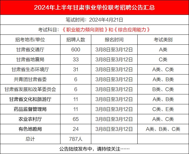 扫码加入甘肃事业单位备考群 根据《事业单位公开招聘人员暂行规定》(人事部令第6号)、《甘肃省事业单位公开招聘人员暂行办法》(甘办发〔2011〕22号)和省人社厅《关于做好甘肃省2024年上半年事业单位公开招聘分类考试公共科目笔试服务有关工作的通知》(甘人社通〔2024〕76号)精神,省交通运输厅所属21个事业单位2024年度面向社会公开招聘事业编制工作人员600名。现将有关事项公告如下: 一、招聘条件 (一)具有中华人民共和国国籍。 (二)拥护中华人民共和国宪法,拥护中国共产党领导和社会主义制度。 (三)具有良好的政治素质和道德品行。 (四)具有正常履行职责的身体条件和心理素质。 (五)具有符合岗位要求的工作能力。 (六)具备岗位所需的学历、专业及技能条件。其中,应聘人员毕业证上标注的学历及专业应当与招聘岗位要求的学历及专业一致。 (七)本科及以下学历年龄为1988年3月至2006年3月期间出生,硕士研究生、博士研究生年龄为1984年3月以后出生,2024年普通高校毕业生不受年龄限制。取得多个层次学历的应聘人员,按照与招聘岗位所要求的学历和专业相符的年龄报名。 (八)具备岗位所要求的其他资格条件。 《甘肃省交通运输厅所属事业单位2024年度公开招聘工作人员岗位列表》(以下简称《岗位列表》)按照国务院学位委员会、教育部《关于印发<学位授予和人才培养学科目录(2011年)>的通知》(学位〔2011〕11号)(研究生层次“学位授予和人才培养学科目录”按照教育部2018年4月更新目录执行)、《教育部关于印发<普通高等学校本科专业目录(2012年)><普通高等学校本科专业设置管理规定>等文件的通知》(教高〔2012〕9号)、《教育部关于公布2019年度普通高等学校本科专业备案和审批结果的通知》(教高函〔2020〕2号)、《教育部关于公布2022年度普通高等学校本科专业备案和审批结果的通知》(教高函〔2023〕3号)、《教育部关于印发<普通高等学校高等职业教育(专科)专业设置管理办法>和<普通高等学校高等职业教育(专科)专业目录(2015年)>的通知》(教职成〔2015〕10号)规定的规范称谓表述。国内外相近专业、高校自设专业、专业硕士由省交通运输厅招聘工作领导小组研究审定后,纳入招聘范围。如果应聘人员所学专业属毕业院校自设专业,须由应聘人员毕业院校开具说明,认定所学的专业属于岗位要求的专业类,并附本人所学课程成绩单,在资格复审时一并提供审核。具体招聘岗位及招聘条件见《岗位列表》。 因犯罪受过刑事处罚的人员、被开除中国共产党党籍的人员、被开除公职的人员、被依法列为失信联合惩戒对象的人员,在国家法定考试、各级公务员及事业单位招考中被认定有舞弊等严重违反录用纪律行为的人员,以及法律法规规定不得报考的其他情形的人员,不得报考。 二、报名 报名采取网上报名的方式,应聘人员在网上申请报名,招聘单位在网上进行资格初审。 (一)岗位查询 应聘人员请登录省交通运输厅网站(www.gsjt.gov.cn)或甘肃省人力资源和社会保障厅网站(http://rst.gansu.gov.cn/)“人事考试”专栏“事业单位公开招聘考试”列表,认真阅读公告内容及其他有关政策规定,查阅《甘肃省交通运输厅所属事业单位2024年度公开招聘工作人员岗位列表》(附件1),详细了解有关信息,确定应聘岗位。 (二)报名 网上报名时,应聘人员应当仔细阅读《诚信承诺书》《报考指南》等内容,报名使用的身份证必须在有效期内,且与考试时使用的本人有效居民身份证一致。 1.提交报考申请。本次报名采取网上报名方式进行,参加甘肃省2024年上半年事业单位公开招聘分类考试集中统一报名,每名应聘人员限报一个招聘单位的一个岗位。 报考申请提交时间为2024年3月8日(星期五)9∶00至3月12日(星期二)18∶00。 应聘人员需登录“甘肃人事考试网”(http://ks.rst.gansu.gov.cn),进入 “网上报名”栏目,点击“甘肃省2024年上半年事业单位公开招聘分类考试(省直)”,使用本人正确手机号码(招聘期间需保持畅通)进行用户注册,注册时必须准确填写本人姓名和身份证号(报名与考试时使用的本人有效居民身份证件必须一致),并妥善保管用户名和密码。上传经“照片处理工具”软件审查后自动生成的照片,照片上传成功后无法修改。 网上报名时,应聘人员提交的报考信息和材料必须真实、准确、有效,并且符合选报岗位的报考条件,否则造成的后果由应聘人员本人承担。对伪造、变造、冒用有关证件、材料骗取考试资格的、恶意注册干扰正常报名秩序的,按照《事业单位公开招聘违纪违规行为处理规定》(人社部令第35号)的有关规定严肃处理,所缴费用不予退还。 网上报名期间,应聘人员如咨询岗位要求的专业、学历、资格条件等事项,请直接与招聘单位联系;报名技术咨询,请与省人力资源考试中心联系。各单位联系方式详见公告最后部分。 2.网上资格审核。网上报名资格初审工作由各招聘单位根据本公告要求和招聘岗位条件,对应聘人员进行资格初审。 3.查询资格审核结果。应聘人员可于2024年3月8日(星期五)9∶30至3月13日(星期三)18∶00期间登录报名系统查询资格初审结果。已通过资格初审的,不能再改报其他岗位,3月12日(星期二)18∶00前未通过初审的,可补充完善信息或改报其他岗位。 如应聘人员在最后一天报名,因审查不通过导致无法改报其他岗位的,责任由