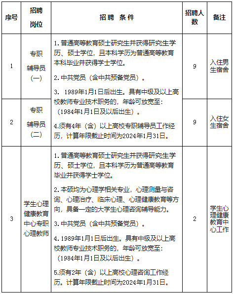 根据《河南省事业单位公开招聘工作规程》(豫人社〔2015〕55号)等文件规定,我校拟面向社会公开招聘工作人员20名。结合我校实际,制定本公开招聘方案。 河南工业大学(Henan University of Technology)位于河南省会郑州市,始建于1956年,现为河南省人民政府与国家粮食和物资储备局签约共建高校。学校2020年入选河南省特色骨干大学,2021年入选河南省“双一流”创建高校,2022年入选教育部“高校学科领域优先发展”规划高校。 学校长期致力于粮食产后领域的基础理论及工程技术研究,构建了集储运、加工、装备、信息、管理等于一体的完整学科体系,拥有全国最完整的粮油食品学科群和实力雄厚的超硬材料学科群;是国内唯一一所紧密围绕粮食产后安全进行学科建设布局的高校。建有3个博士后科研流动站,拥有4个博士学位授权一级学科,25个硕士学位授权一级学科,14个硕士专业学位授权类别,24个河南省一级重点学科。 建校至今,学校始终牢记“为党育人、为国育才”初心使命,落实立德树人根本任务,秉持“明德、求是、拓新、笃行”的校训和“育人为本、质量立校、特色发展”的办学理念,坚持“扎根中原、立足行业、服务全国、面向世界”的办学定位,弘扬“崇尚科学、勇于探索、报国兴学、自强不息”的工大精神,不断巩固和强化在粮油食品、磨料磨具与超硬材料领域形成的办学特色与优势,实现了办学规模、层次、内涵和质量的提升,先后为国家输送了25万多名优秀毕业生,粮食行业半数以上的管理精英和技术骨干均出自我校,被誉为我国粮食行业的“黄埔军校”。 学校成立由校领导任组长,党委组织部、校纪委(监察专员办公室)、人事处、学生处等负责人为成员的公开招聘工作领导小组,领导小组下设办公室,负责招聘的组织、协调工作,办公室主任由人事处负责人兼任。 根据学校岗位空缺情况和发展需要,招聘专职辅导员18名,学生心理健康教育中心专职心理教师2名。详见附件《河南工业大学2024年公开招聘工作人员一览表》。 为保证师资队伍的稳定性,各类岗位一经录用,原则上4年内不得转出所聘岗位。 (一)应聘人员必须具备的基本条件 1.具有中华人民共和国国籍。 2.遵守宪法和法律。 3.具有良好的政治素养和道德品行。 4.身心健康,具有正常履行职责的身体条件。 5. 普通高等教育硕士研究生并获得研究生学历、硕士学位,且本科学历为普通高等教育本科毕业并获得学士学位。 6.应聘专职辅导员岗位须有4年(含)以上高校专职辅导员工作经历,应聘学生心理健康教育中心专职心理教师岗位须有2年(含)以上高校心理咨询工作经历。计算年限截止时间为2024年1月31日。 7.年龄为:(1989年1月1日及以后出生);具有中级及以上高校教师系列专业技术职务的,年龄可放宽至40周岁(1984年1月1日及以后出生)。 8.中共党员(含中共预备党员)。 9.其他要求见附件《河南工业大学2024年公开招聘工作人员一览表》。 (二)有下列情形之一的不得报名应聘 1.曾因犯罪受过刑事处罚的人员或曾被开除公职、开除党籍人员。 2.刑事处罚期限未满或者涉嫌违法犯罪正在接受调查的人员。 3.尚未解除党纪、政纪处分或正在接受纪律审查的人员。 4.曾在公务员招录、事业单位公开招聘考试中被认定有舞弊等严重违反招聘纪律行为的人员5年内不得参加本省内各级事业单位公开招聘。 5.国家和河南省另有规定不得应聘到事业单位的人员。 (一)公布招聘信息 本次招聘方案经河南省人力资源和社会保障厅审核备案后,同时发布在河南省人力资源和社会保障厅(网址http://hrss.henan.gov.cn/)和河南工业大学人事处主页(网址https://rsc.haut.edu.cn/),发布时间为2024年2月26日至2024年3月5日。招聘全过程的具体安排详见学校人事处主页,应聘人员应及时关注。 (二)报名和资格审查 1.报名采用网上报名方式,请登录河南省属大中专学校教师公开招聘网上报名系统(网址http://zhaopin.haedu.gov.cn/,以下简称“招聘系统”),通过“硕士及硕士以下学历报名入口”,点击“河南工业大学”进行报名,报名时间为2024年3月6日08:00至2024年3月8日18:00,每人限报我校1个岗位,请应聘者慎重选报。报名成功后务必牢记登录密码,应聘者可凭此密码登录招聘系统查询个人相关信息。 2.应聘人员应及时登录招聘系统查询资格审查结果。通过报考资格审查人数与招聘岗位人数的比例不低于3:1,达不到规定比例的,相应核减该岗位招聘人数,直至取消该岗位招聘。 3.通过网上资格审核者须本人按照规定时间到学校指定地点进行现场资格确认,具体时间和地点另行通知,逾期不到者视为自动放弃。 现场资格确认需携带以下材料: (1)本人身份证原件和复印件。 (2)本、硕阶段学历、学位证书原件和复印件。 (3)各本、硕阶段学信网“教育部学历证书电子注册备案表”和“中国高等教育学位在线验证报告”。 (4)境外高校毕业生须提供学历(学位)证书、教育部留学服务中心出具的学历学位认证证书原件及复印件。 (5)中共党员(含中共预备党员)证明材料。 (6)相关证明: 1)社会保险个人参保证明(可在支付宝下载打印); 2)劳动或聘用合同; 3)工作经历证明; 4)年龄超过35周岁的需提供中级及以上高校教师专业技术职务任职资格证书等证明材料。 以上材料请按照人事处主页发布的《2024年公开招聘硕士工作人员资格审查须知》要求准备。 重