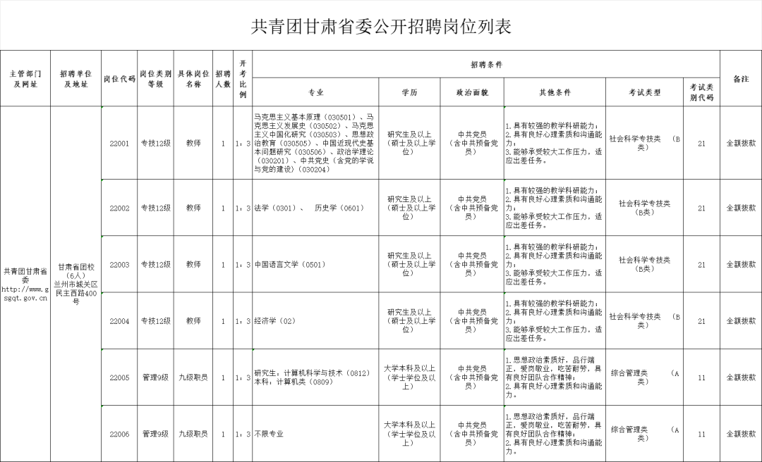 根据《事业单位公开招聘人员暂行规定》(人事部令第6号)《甘肃省事业单位公开招聘人员暂行办法》(甘办发〔2011〕22号)和《关于做好甘肃省2024年上半年事业单位公开招聘分类考试公共科目笔试服务有关工作的通知》(甘人社通〔2024〕76号)精神和工作需要,共青团甘肃省委所属事业单位现面向社会公开招聘工作人员6名(详见《共青团甘肃省委公开招聘岗位列表》)。现将有关事项公告如下: