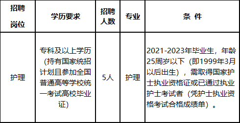 无为市中医医院因临床业务发展需要,现面对社会公开招聘护理专业人员5名。现将岗位条件及报名方式公布如下: