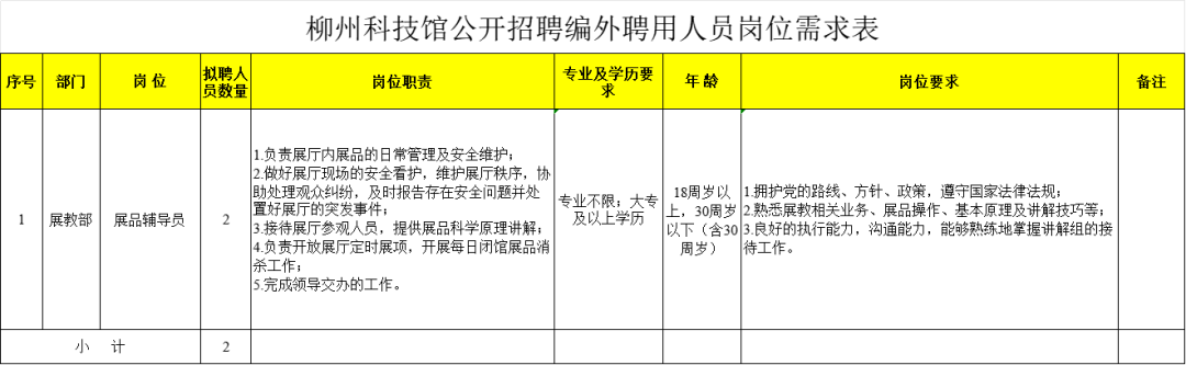 展品辅导员2名,具体内容详见《柳州科技馆公开招聘编外聘用人员岗位需求表》(附件1)。