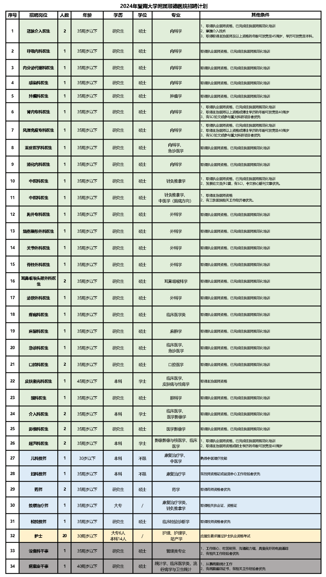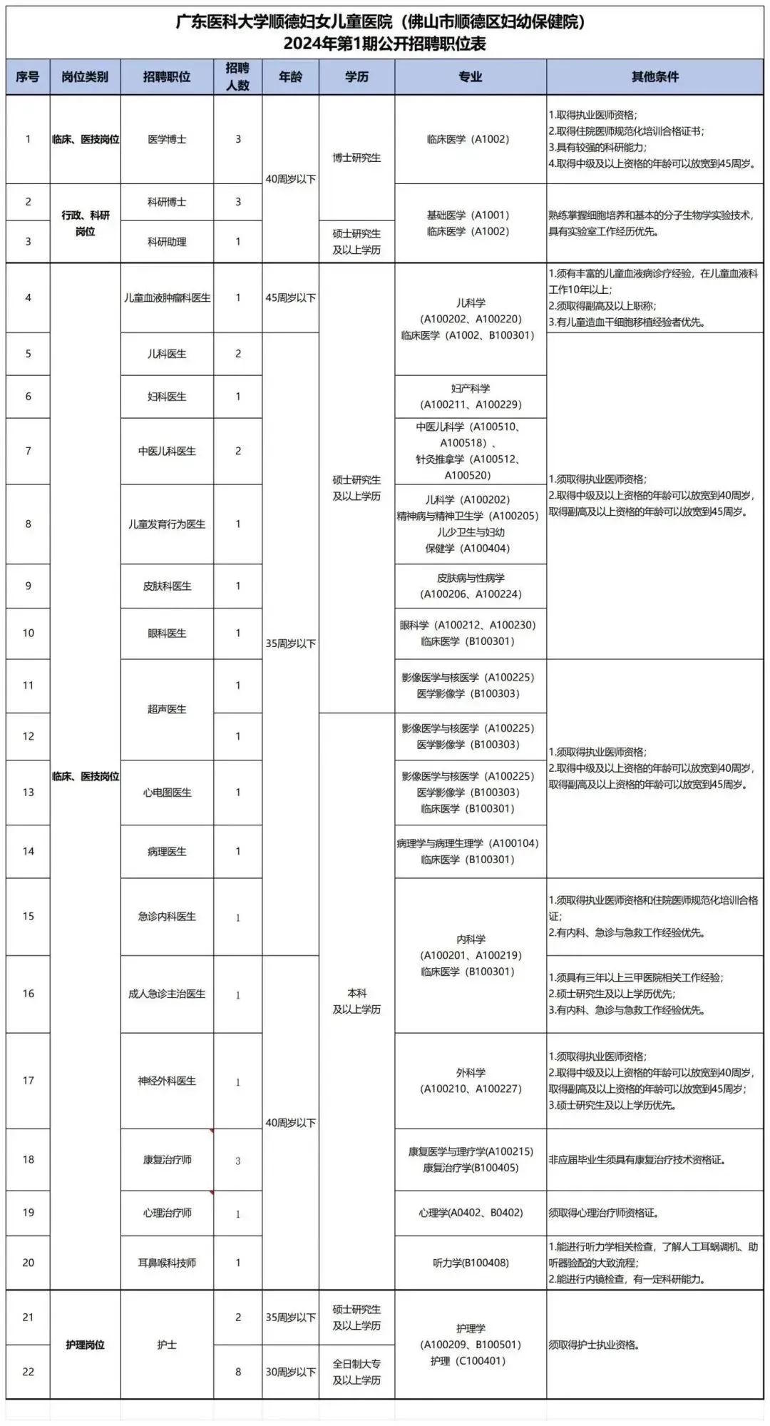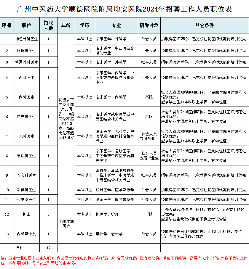 5、岗位所需的其他条件详见附件《广州中医药大学顺德医院附属均安医院2024年招聘工作人员职位表》。