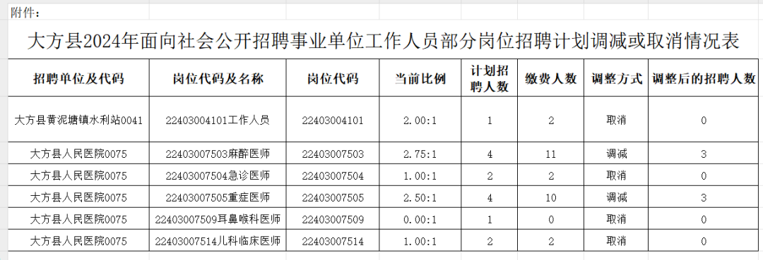 大方县2024年面向社会公开招聘事业单位工作人员部分岗位招聘计划减少或取消的公告