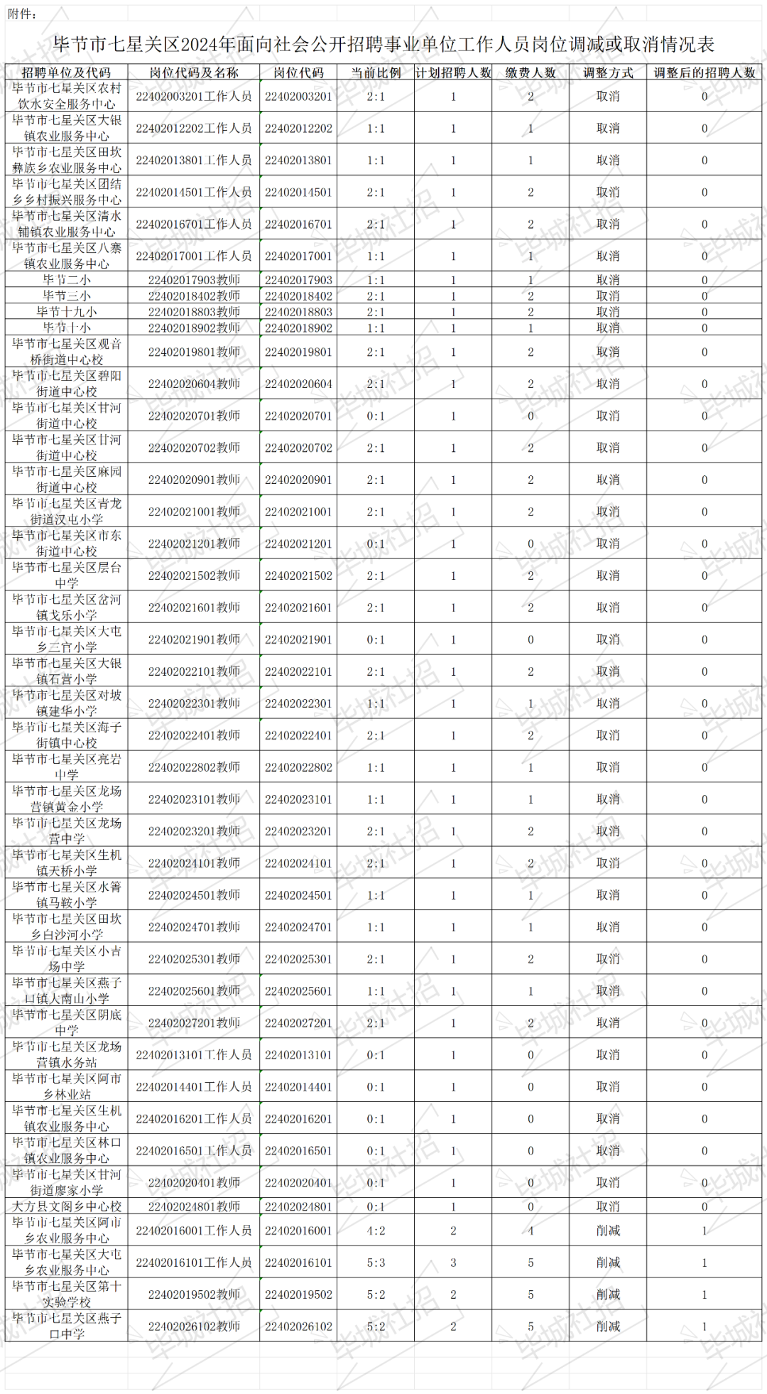 毕节市七星关区2024年面向社会公开招聘事业单位工作人员部分岗位招聘计划减少或取消的公告