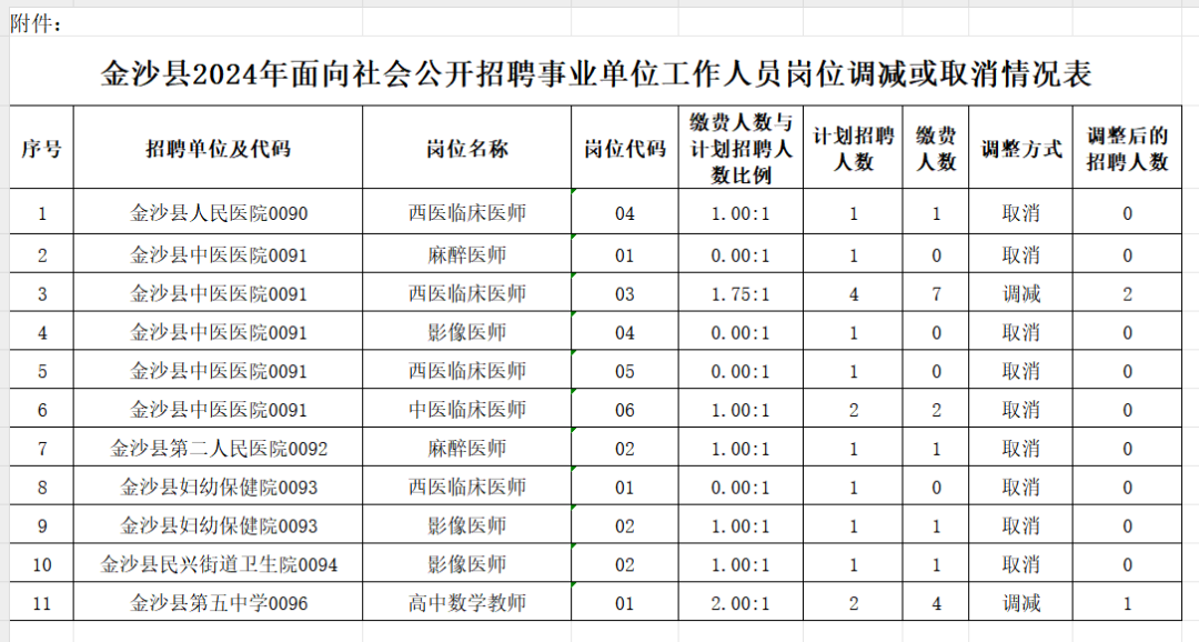 金沙县2024年面向社会公开招聘事业单位工作人员部分岗位招聘计划减少或取消的公告