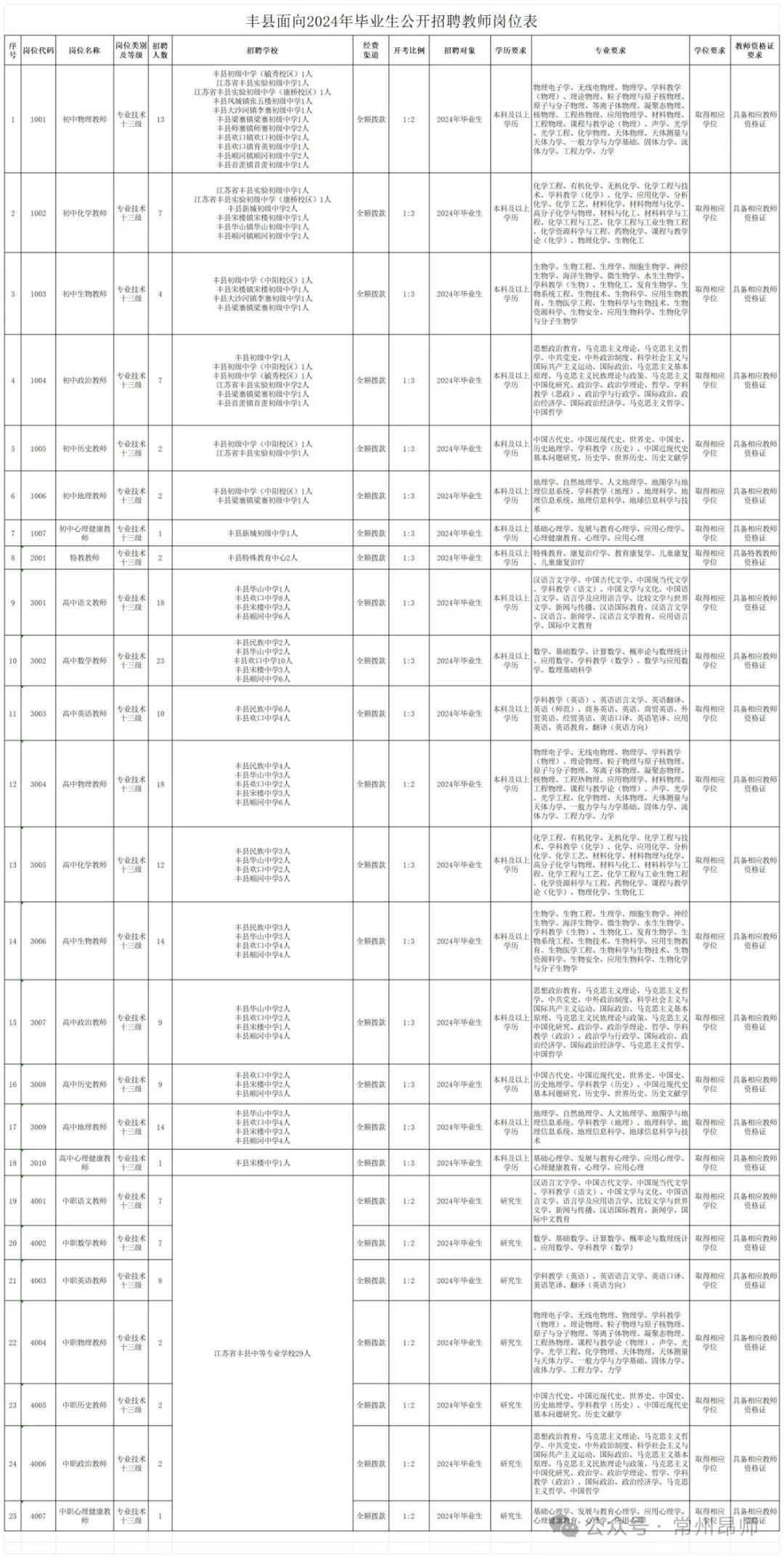 (四)学历学位条件:各岗位学历学位条件详见《丰县面向2024年毕业生公开招聘教师岗位表》(以下简称《岗位表》)。