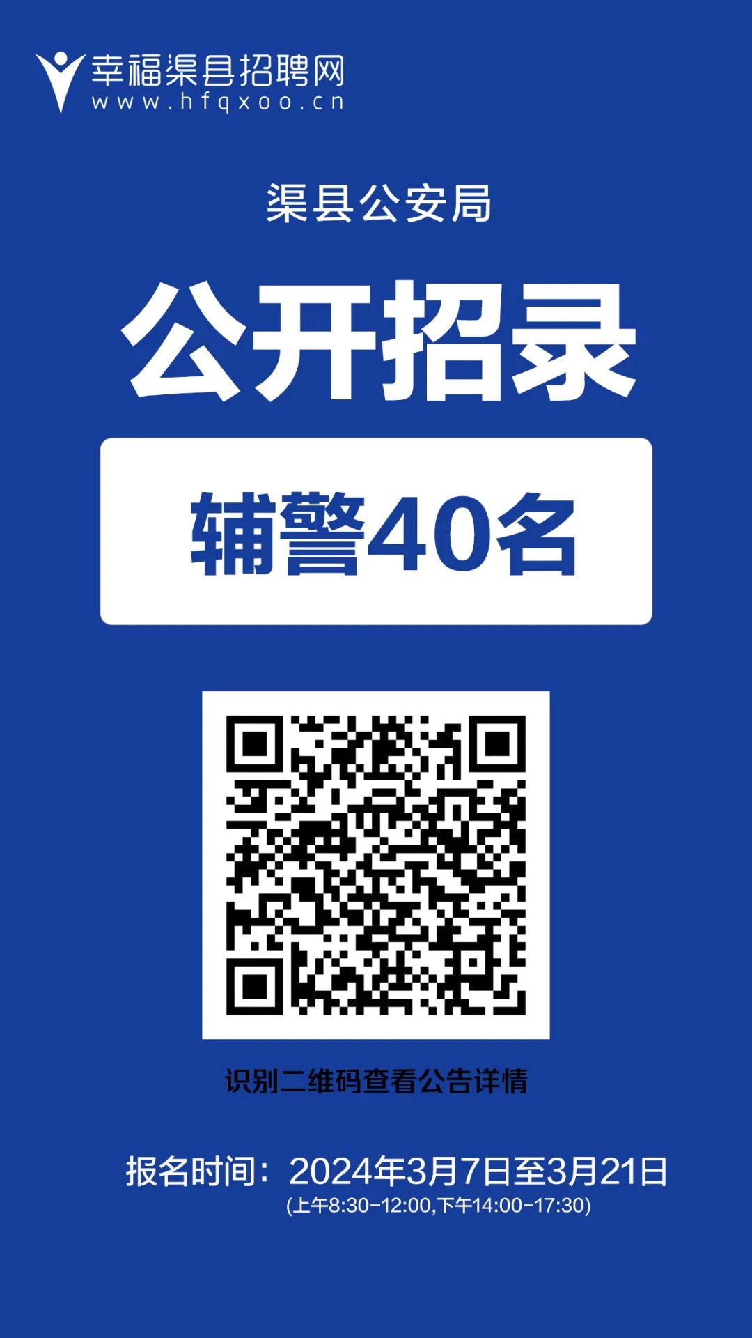 计划公开招聘警务辅助人员40名(限男性),由渠县公安局对符合招聘条件的人员进行岗位分配。