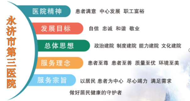 永济市第三医院(城北街道社区卫生服务中心)为“全国百强社区卫生服务中心”、“国家优质示范社区卫生服务中心”,2023年8月通过运城市卫健委评审验收,定为二级综合医院,是我市城乡居民医疗保险及城镇职工医疗保险、社会保险的定点医疗机构,设有康复科、内科、外科、妇产科、眼耳鼻喉科等多个临床科室,开展血液透析、高压氧治疗等,现有在岗职工150余人,中心占地15亩,建有门诊楼、住院楼、医技楼、行政楼等,业务用房面积9260平方米,开放标准化床位159张。