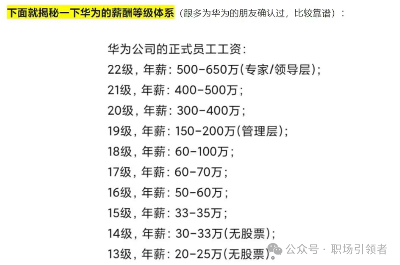 华为的薪酬制度根据岗位级别的不同而有所差异,旨在鼓励员工的个人成长和职业发展。初始级别为13级,而顶级则为22级,展示了华为对不同层次技术和管理人才的需求及其对公司贡献的认可。值得注意的是,只有13级和14级的新入职员工是不被配发股票的,这一政策旨在激励员工通过努力工作来提升自己的职级和薪酬待遇。