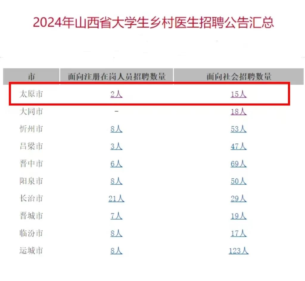 根据《事业单位人事管理条例》,我省委托山西省卫健委人才中心将组织实施山西省大学生乡村医生专项计划2024年公开招聘工作人员笔试。现将有关事项公告如下:参加本次公开招聘的岗位涉及太原市、大同市、阳泉市、长治市、晋城市、忻州市、吕梁市、晋中市、临汾市、运城市10个市56个县(区、市)的440个村卫生室,共计招聘440人。