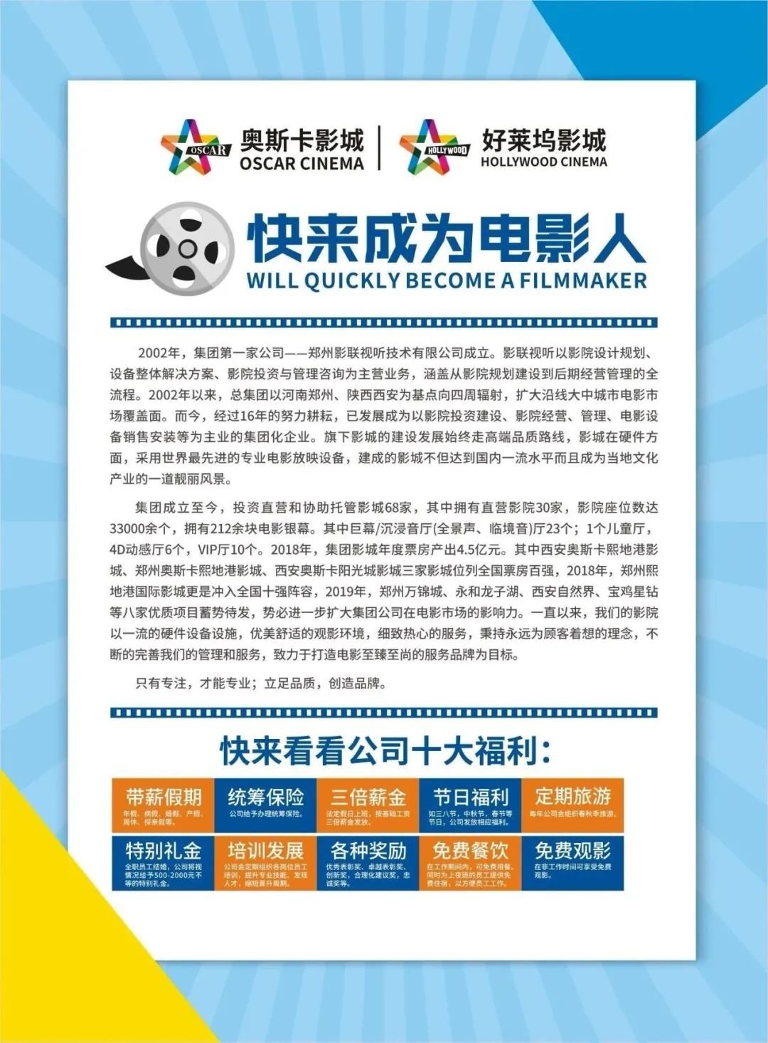 3、服从工作岗位需求,热爱电影事业,能适应早晚班.