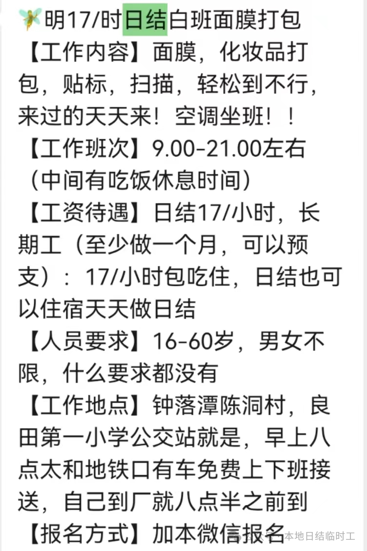 【待遇】19元/小时,每天8~9小时、包吃住小区有空调热水器洗衣机。