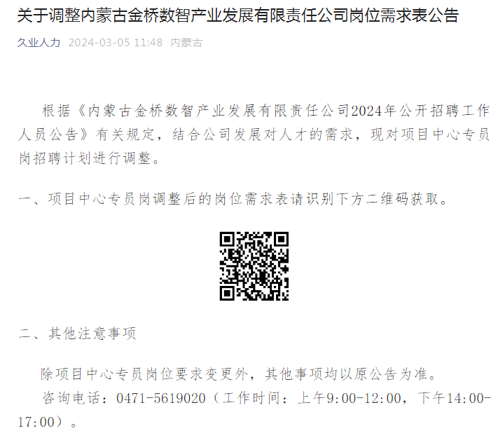 国企!内蒙古金桥数智产业发展有限责任公司2024年公开招聘工作人员