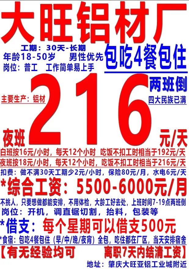 星荣人力满足企业用工单位用人灵活便捷的需求,同时促进了求职者实现多方式、多元化就业。 本公众号可为有需求的用人单位免费发布招聘信息,欢迎有需要正式工、兼职人员、一线生产工、临时工等用工单位咨询合作。 项目负责人:谢生 13556568838微信同号 一、大旺铝材厂 216元/天,每周可借支 18-50岁,男女不限 普工岗位,工作简单上手 包吃4餐,包住,吃住都在厂区 当天安排宿舍 二、鼎湖坑口电子厂长白班 17元长白班涨价了! 月结: 外宿17元/小时 住宿16元/小时 日结: 外宿15元/小时 住宿14元/小时 结算方式自由选择! 长白班+坐班,包吃工作餐+包住。免体检! 要求:16-45岁,男女不限,身体健康。 工作情况:主要做电子产品组装,打螺丝,测试,包装工作,岗位简单轻松。空调车间,不用穿无尘服 满勤七天后每周可借支! 日结结算方式:押7天工资后第8天天天下班发工资(不用加班发100元/天,加班的发120元/天结算,差价部份每月月底发薪日统一发放) 工期90天至长期 星期一至星期六下午13:30天天安排!!! 工作地址:鼎湖区坑口附近 三、鼎湖新区电子配件厂 18元/小时,包吃住 月薪高达6000元/月以上,吃住环境好,年龄18 ~50岁,男女不限!包食包住。 质检,仓库,压合,上胶岗位,工作简单,自由,厂区人性化管理,工作环境干净,宿舍饭堂都在园区。 公寓宿舍,空调,热水器,书桌等一应俱全 两班倒,月休2~4天 面试时间下午两点 地址: 肇庆鼎湖永安 四、端州城西梅庵手机厂 日结:13元/小时 月结:14元/小时 招聘要求:年龄:16 ~45岁,男女不限! 工作情况:长白班坐班,包食包住+空调车间,不用体检,工作简单轻松易懂。 食住情况:空调宿舍+热水。饭堂,宿舍,车间都在一个园区。 綜合工资:4500-5000元 工作岗位:装配,打包,质检等岗位。 月结满勤七天每周可借支!!! 工作地点: 端州区城西 下午1:30分统一安排。 五、端州睦岗啤酒厂 社会工:15元/小时,工期2个月至长期 工作主要是操作流水线的生产设备,工作简单 男女不限,男:18-50岁,女:18-45岁。 综合工资:3200-4500元左右 1、上班时间:早班8.00-17.30、中班17.30-01.00、零班01.00-8.00 2、包吃不包住,(工厂有厂车接送)早、中班提供免费工作餐,夜班不提供; 3、需要健康证(没有健康证可以去办理,当天办理当天出健康证) 4、面试要求:需要带上身份证原件,身份证复印件两张,一寸照片两张。 地点:睦岗 六、鼎湖水坑空调车间电子厂 月结15元/小时 日结14元/小时 结算方式自由选择。 长白班+坐班,包吃工作餐+包住。免体检! 要求:16-45岁,男女不限,身体健康。 工作情况:主要做电子产品组装,打螺丝,测试,包装工作,岗位简单轻松。空调车间,不用穿无尘服 满勤七天后每周可借支! 工期60天至长期 星期一至星期六下午13:30天天安排!!! 工作地址:鼎湖区坑口附近 七、鼎湖永安新区电子厂 临时工,长白班,长白班 月结16元/小时 日结15元/小时 结算方式自由选择 工期60天至长期 年龄:18~42岁,男女不限! 【上班时间】每天10-11小时 【吃住安排】包住,4-6人/间,空调热水齐全,水电费平摊;先吃后补,每餐8元,每天补16元。 【工作内容】做电子产品,质检、组装等工作,工作简单易懂!! 满勤七天每周可借支!!! 星期一至星期六下午13:30分统一安排! 工作地点: 鼎湖永安 八、高要金利五金塑料制品厂 长白班冲压岗位17元/小时 二班倒注塑岗位18元/小时+10元夜班䃼贴。 年龄:18~45岁,男女不限 包吃包住,不用体检 工期60天~长期。 满勤七天后每周预支300~500元。 工作岗位:注塑机,CNC数控机等,大部分坐班 工作地点:高要金利 下午13:30统一安排。 九、禄步食品包装厂 大量招聘临时工,15元/小时 直接带行李入职上班,空调车间。 要求:18-55岁,男女不限,身体健康。 主工要作: 糖果零食的包装,折纸盒,整理点数的小密胶封袋,称重,锅炒等等岗位。 工作时间:8:00-12:00,12:30-17:30,18:00-21:30 夜班时间:20:00-8:00 工资待遇:白班15元/小时,夜班15元/小时+10元补贴,综合月薪在4800-5200元左右。 伙食住宿:包吃包住,水电平摊。 工作地址:高要禄步 入职要求:身份证原件,复印件两张。 周一至周六正常上班时间可以安排。 十、云浮郁南大湾环保材料厂 第一个月保底16元/小时,第二个月起5000-6500元/月,班组计件 【福利待遇】包吃五餐,早、中、午、晚、宵夜,包住,公寓电梯宿舍,有夫妻房,第二个月起购买社保,晋升机会大,厂区配有员工娱乐场所,节日发放丰厚福利、年底发放年终奖、不定期旅游等福利多多 【招聘岗位】做石英石,主要收开机、粉料、辅料、手工线、成品包装岗位 【上班时间】开机、粉料、辅料上班时间:早班07:00-17:30,中班17:00-04:30,手工线、成品包装上班时间:早班07:30-19:30, 夜班19:30-07:30,所有岗位都是半个月转一次班,吃饭、宵夜时间各1小时 【要求】男18-50岁,女18-47岁,男女不限,能吃苦耐劳 工作地址:大湾工业园 备注:周一至周五正常上班时间可安排 十一、肇庆鼎湖大型运动鞋厂 包三餐、包住、长白班 18-55岁,男不女限 社会工15.5元每小时 【工班作次】大部分坐班 【工作项目】鞋厂 【年龄情况】18-55岁,视力良好! 【面试要求】不需要文化 【宿舍条件】4~7人调间空房、水电平摊 【生活包吃】工作餐、三餐吃为饱止 【商业保险】每月扣50元 【薪资发放】每月20~22号 注:自离薪无资、离职需提前15天申请,长年稳定单、工期两月个起,手工活无气味。 十二、云浮市云安区都杨电子厂 18元/小时, 18元/小时