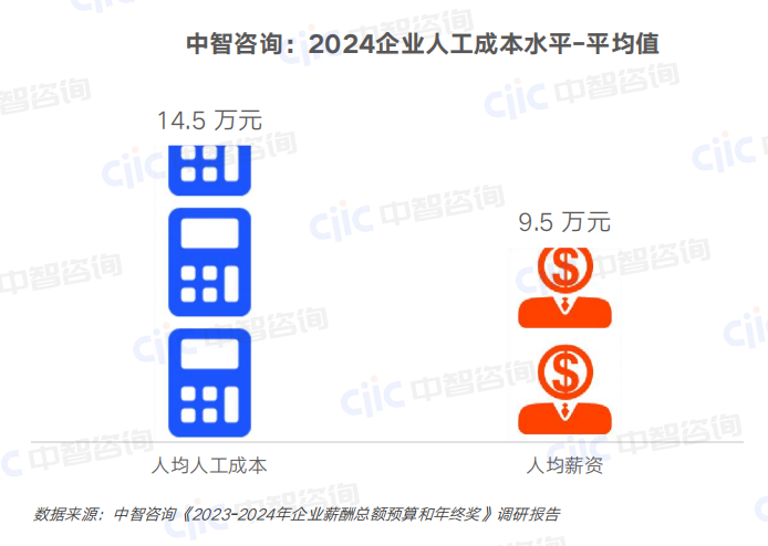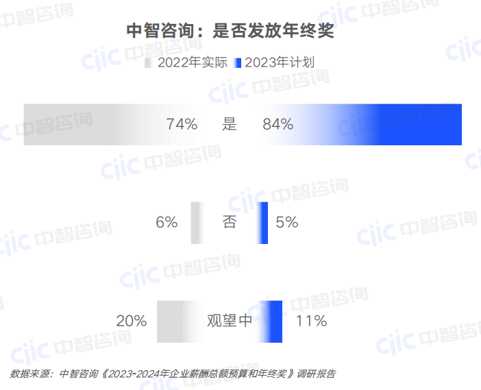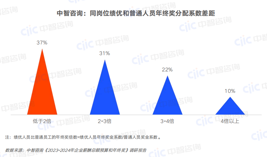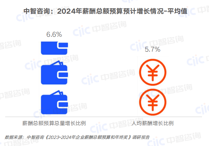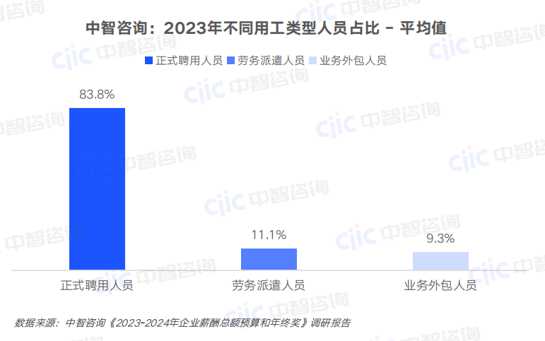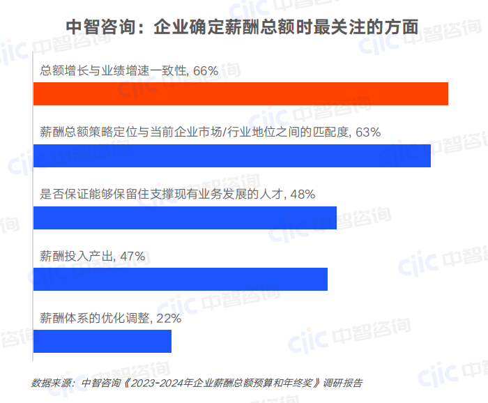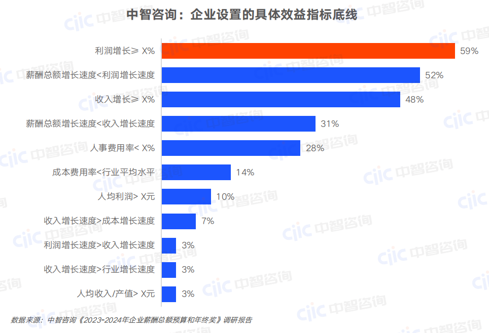 当前经济环境下,年终奖与涨薪幅度的话题成为各行业关注的焦点,制定薪酬总额预算也是企业管理者和HR年初最紧要的工作之一。 中智咨询长期关注企业薪酬总额预算和年终奖发放的趋势与实践,定期在市场上收集相关信息并分享相关策略和经验。基于423家参调企业关于薪酬总额预算和年终发放的最新数据和信息,发布《2023-2024年企业薪酬总额预算和年终奖》调研报告(以下简称《报告》)。 《报告》的关键发现如下: 接下来,我们将对以上发现展开进行解读,期望为企业管理者和HR们提供最新数据信息和实践参考: 一、薪酬总额预算管理 1、 关注因素和指标:企业确定薪酬总额预算关注和业绩增速一致性,预期利润增长率和人事费用率是重点参考指标薪酬总额预算关联的业绩指标,调研发现近八成企业主要关注预期利润增长率,其增长情况直接关系到企业的盈利能力和发展前景,这也反映出企业对薪酬增长和盈利增长匹配度的重视。 2、 涨幅变化:2024年薪酬总额预算平均增幅为6.6%,人均薪酬涨幅为5.7%,增长同比放缓调研结果显示,2024年企业薪酬总额预算总量的增长比例平均为6.6%,人均薪酬涨幅平均为5.7%,增幅较上年有所放缓。 不同行业、企业之间的分化现象明显,部分企业甚至出现负增长,即预算缩紧。企业预算额度和业绩预期增长关联性大,少部分企业面临着较大的经营压力,减少了薪酬预算投入,更加注重成本控制。 2024年薪酬总额预算各项目的增长情况有所差异: ● 七成企业预计法定福利、工资总额增长,四成企业增幅在5%以内 相比2023年的薪酬预算,七成左右企业预计2024年的社保费用、公积金和工资总额将有所增长,其中四成左右企业预计增幅在5%以内,四分之一的企业预计增幅在6%-10%之间。法定福利属于企业的刚性成本,一般随缴纳基数调整每年上涨;企业工资总额的增长受调薪、薪酬水平和人员编制变化等因素影响。 ● 六成企业预计福利、招聘、培训费用和去年持平,预算有限侧重差异化精准激励 20%-30%的企业预计福利费用、工会经费、教育培训经费、招聘费用有所增长,六成左右企业和上年持平。薪酬总额预算中的这类项目,一般属于软性成本,在成本管控趋严的背景下,这类项目一般没有增长,企业更加关注预算成本的合理分配和利用,旨在通过精益化管理和精准激励有效增加员工福祉,促进绩效提升。 3、 人工成本:2023年人均人工成本14.5万元,人均薪资9.5万元,不同类型企业水平差异大企业在制定薪酬总额预算时,人均人工成本和人均薪资是重要的参考指标。 调研结果显示,2023年企业的人均人工成本平均值为14.5万元,人均薪酬平均值为9.5万元,较上年二者分别增长5.1%和5.6%,企业的成本压力有所上升。 4、 控本提效:2023年企业人事费用率平均值16.9%,企业愈加注重控本提效并设置效益指标底线在薪酬总额预算制定过程中,除了薪酬涨幅、人工成本水平这类指标,近年来企业愈加关注人工成本投产效率指标。薪酬预算制定关联的人效指标中,企业最为关注的是人事费用率,其次为人工成本利润率、全员劳动生产率等。 调研显示,2023年企业人事费用率平均值为16.9%,较上年略有增长,这可能是受到薪酬水平提高、业绩增速下滑等因素的影响。持续关注人效指标表现,可以帮助企业评估自身人力资源投入的合理性并制定改善措施,包括优化用工结构、改进薪酬架构和激励方案等。 另外,在控本提效的背景下,两成企业在制定薪酬总额预算时会对效益和效率指标设置底线目标,还有半数以上企业表示目前虽未设置但正在考虑设置。具体来看,近六成企业表示对经营利润设置了底线增长目标,半数以上企业要求薪酬总额增速低于利润增长速度,而人事费用率也是重要管控指标之一。 5、 人员配置:2024年企业人员编制增长率平均为6.3%,企业更加关注人员配置的合理性,薪酬预算管理更加全面人员编制是影响薪酬总额预算重要的方面,调研显示2024年企业人员编制增长率平均值为6.3%,增速较上年有所放缓。 从细分维度来看,不同企业的人员编制增长较为分化,例如部分处于快速发展期的企业,其人员编制增长率达20%以上,而处于转型变革期的企业中,一些企业的人员编制呈负增长。 针对人员定编管理,65%的参调企业会采用量化定编方法,其中预算控制法和业务流程法的采用比例均在四成以上。针对人员编制总数和不同类型员工的编制数量,企业一般会采用多种定编方法进行校验核定,旨在应用量化方法制定更为科学合理的人员编制方案。 调研过程中,我们发现在人员编制增幅放缓的趋势下,企业更加关注人员配置的合理性,旨在通过优化结构配比提升人员效率。以不同用工形式的人员比例为例,调研显示劳务派遣和业务外包人员占比平均值均在10%左右,并且预计2024年外包人员占比的平均增长率在10%以上。 随着用工形式的多元化,企业在制定薪酬总额预算时除了考虑正式雇佣人员,还需要考虑劳务派遣、业务外包人员的数量配比、成本费用等内容,这有助于企业更加全面地分析人力资源成本的构成,制定更为精准的预算管理决策。 二、2023年终奖发放策略与实践 1、 发不发:2023年超八成参调企业表示发放年终奖,是否发放和企业业绩关联性较大随着疫情得到有效控制,社会经济运转回归正常,企业经营业绩也稳步恢复,企业年终奖的发放比例有所回升,在参与调研的企
