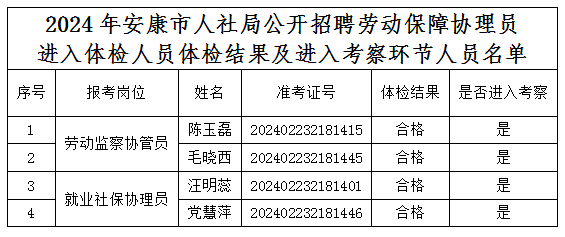 2024年安康市人社局公开招聘劳动保障协理员进入体检人员体检结果及考察工作安排公告