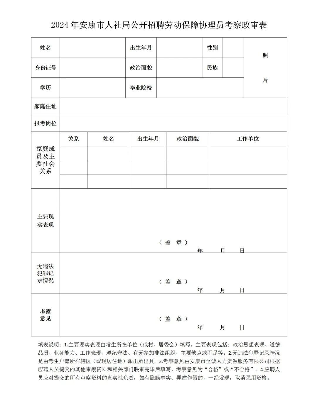 依据《2024年安康市人力资源和社会保障局公开招聘劳动保障协理员公告》规定,现对本次招聘进入体检人员体检结果及考察相关工作安排公告如下: 本次公开招聘劳动保障协理员体检工作于2024年3月5日进行,3月6日体检环节结束。共有4名应聘人员参加体检,体检结果及进入考察环节人员名单见附表1。(二)考察时间:2024年3月7日至2024年3月8日重点考察应聘人员的思想政治表现、道德品质以及与招聘岗位相关的专业素养、业务能力等,并再对应聘人员的资格条件进行复审。考察不合格的,取消应聘资格。因应聘人员放弃或考察不合格形成的缺额,从该招聘岗位参加面试且面试成绩不低于60分的人员中,按照考试综合成绩从高到低递补人员参加体检,体检合格,再进行考察。1.《2024年安康市人社局公开招聘劳动保障协理员考察政审表》(见附表2),请进入考察人员仔细阅读考察政审表填表说明,按规范填报;以上资料请于2024年3月11日12:00点前递交至安康市人力资源服务产业园314室(至诚人力公司)。 安康市至诚人力资源服务有限公司