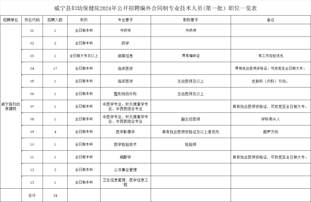 威宁县妇幼保健院关于2024年公开招聘编外合同制专业技术人员(第一批)工作方案的通知报名方式:现场报名 报名时间:2024年2月26日起报名 报名地址:威宁县妇幼保健院办公楼二楼人事科 笔试时间:另行通知 笔试科目:相关专业知识 为保障全县妇女儿童身体健康及生命安全,进一步强化我院人才队伍建设,引进优秀人才参与到医院的发展建设中来,为医院高质量发展储备人才,提高医院整体医疗服务能力和水平。经威宁县妇幼保健院党委研究决定,面向社会公开招聘编外合同制专业技术人员34名,为确保本次招聘工作顺利开展,特制定本方案。 一、招聘原则 (一)坚持党管干部、党管人才的原则; (二)坚持德才兼备、以德为先,五湖四海、任人唯贤的原则; (三)坚持按需设岗、按岗招聘、人岗相适、人事相宜的原则; (四)坚持公开、公平、公正、择优的原则。 二、招聘岗位和要求 根据工作需要,我院2024年拟公开招聘编外合同制专业技术人员34名。具体招聘岗位及要求详见《威宁县妇幼保健院2024年公开招聘编外合同制专业技术人员(第一批)职位一览表》(附件1)。 三、招聘条件 (一)报名参加公开招聘的人员应具备下列基本条件: 1.具有中华人民共和国国籍; 2.拥护中华人民共和国宪法,拥护中国共产党的领导和社会主义制度,具有良好的政治素质和品行,具有为人民服务的思想,具有正确的政治立场、政治态度、理想信念和思想品德; 3.遵纪守法,诚实守信,品行端正,人格健全; 4.安心应聘岗位工作,有较强的事业心和责任感; 5.具有胜任应聘岗位需要的相关专业知识和工作能力; 6.年龄在18周岁及以上(2006年2月26日及以前出生)、35周岁及以下(1989年2月26日及以后出生),具有主治医师及以上职称的人员年龄可放宽到45周岁(1979年2月26日及以后出生); 7.学历、学位、资格等要求详见《威宁县妇幼保健院2024年公开招聘编外合同制专业技术人员(第一批)职位一览表》(附件1); 8.身体健康,符合应聘岗位要求的其他具体资格和条件。 (二)以下人员不得报考: 1.不能坚持党的基本路线,在重大政治问题上不能与党中央保持一致的; 2.曾因犯罪受过刑事处罚或受过劳动教养的人员,受处分期间或正在接受纪检监察机关、司法机关立案调查未结案的人员; 3.曾被开除公职或在机关(含参照公务员法管理单位)、事业单位被辞退未满5年的; 4.在各级公务员招录或事业单位招聘考试中被认定有舞弊等严重违反考试录(聘)用纪律行为且仍在不得报考期限内的; 5.被依法列为失信联合惩戒对象的; 6.不符合招聘对象、招聘条件或岗位所需资格条件的; 7.其他有法律、法规规定不得聘用的。 四、招聘程序 (一)发布公告 面向社会公开发布招聘信息,在威宁县妇幼保健院微信订阅号及院务公开栏发布招聘公告。 (二)报名及资格审核 1.采取现场报名、现场资格审查。本公告招聘岗位为长期招聘岗位,报名时间自公告发布之日起,至名额招满为止。公告发布后,根据岗位报名情况,在15个工作日后不定期启动考核程序,岗位一旦开考即停止报名,未开考的岗位报名有效期截至岗位开考前。 2.报名人员对所提供材料的真实性负责。对提供虚假材料的,伪造、更改有关证件、材料、信息骗取报名资格的,以及存在舞弊行为,在政审中进行非组织活动的,一经查实,立即取消聘用资格。资格审查贯穿于招聘工作全过程,在办理聘用手续后,若核查发现聘用人员提供的信息材料是虚假、伪造、更改的,则给予解聘处理; 3.报名人员应详细了解资格条件、报名程序以及有关规定等内容,根据自身情况选择完全符合报名条件的岗位进行报名,报名与面试时使用的有效居民身份证必须与本人一致。报名时,应聘人员须仔细阅读《威宁县妇幼保健院2024年公开招聘编外合同制专业技术人员(第一批)工作方案》中所规定的招聘条件和《威宁县妇幼保健院2024年公开招聘编外合同制专业技术人员(第一批)职位一览表》(附件1)中的各项要求,应聘人员对所提交材料的真实性、准确性、完整性、有效性负责。报考人员因身份证过期、信息填写不真实、不完整或填写有误,导致审核不过的,后果由报考人员本人承担。 4.现场报名时间和地点: (1)报名时间(不接受网上报名):2024年2月26日开始(工作日上午8:30-12:00;下午14:00-17:30;节假日除外)。此公告长期有效。 (2)报名地点:威宁县妇幼保健院办公楼二楼人事科。 5.现场资格审查时报考人员需提供以下资料: (1)《威宁县妇幼保健院2024年公开招聘编外合同制专业技术人员(第一批)岗位报名表》(附件2)、身份证、毕业证书、学位证书及学信网查询的学历《电子注册备案表》、专业技术资格证书、执业证等有效证件原件、复印件各一份;(审核原件、收取复印件) (2)出具有效《教育部学籍在线验证报告》,包括全日制学历以及最高学历; (3)公开招聘诚信报考承诺书(附件3)(一式两份); (4)报名费100元/人。 (三)笔试、面试 1.笔试、面试由威宁县妇幼保健院招聘工作领导小组根据报名情况适时准备笔试、面试。笔试、面试环节由中共威宁县妇幼保健院纪律检查委员会全程参与并监督。 2.考试方式和成绩占比 如同一岗位招聘人数与报名人数超过1:10(不含1:10)及以上采取笔试+面试的方式,总成绩=笔试成绩60%+面试成绩40%。按照笔试成绩由高分到低分排名顺序,单个岗位招聘计划人数与该岗位参加笔试人数1:3的比例
