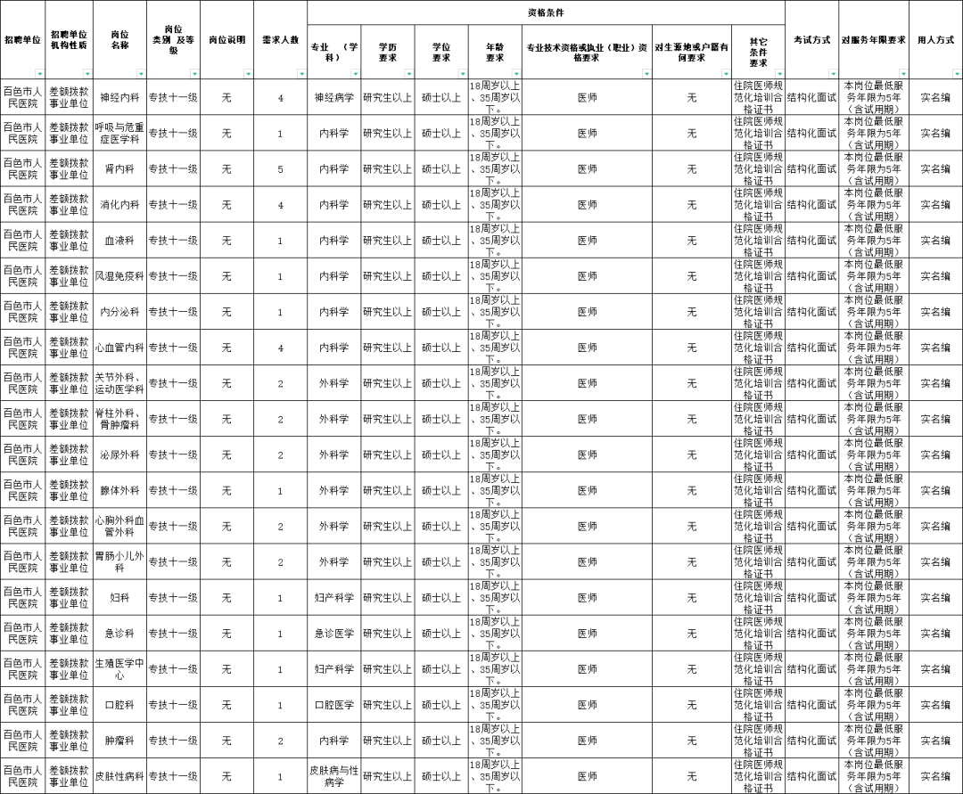 ▲长按关注公众号,回复 0306 查看完整公告丨下载附件 一、招聘人数 百色市卫生健康委员会2024年春季计划招聘高层次、急需紧缺专业技术人才61名(具体招聘岗位详见附件1)。 以上仅为部分岗位 二、招聘方式 1.采取电子邮件线上报名、现场复核报名资格的方式进行。根据不同招聘对象分两类招聘方式:①取得博士学历学位的研究生或副高以上职称的专业技术人员,可采取直接体检、考察的方式;②取得硕士学历学位的研究生或中级职称的专业技术人员,可采取直接面试、体检和考察相结合的方式。 2.采取结构化方式面试。 三、招聘程序 (一)岗位查询 应聘人员从2024年3月6日起,可以登录百色人才网(http://bs.gxrc.com)查阅招聘岗位信息。 (二)网上报名 1.采取电子邮件报名方式进行。应聘人员需填写《百色市卫生健康委员会2024年公开招聘高层次、急需紧缺专业技术人才报名表》(附件2,以下简称《报名表》)并经本人签字,同时将《报名表》、本人有效身份证(正反面)、学历(学位)证书(还需附上学信网打印的《教育部学历证书电子注册备案表》)、本人签名的报考诚信承诺书及具有符合《计划表》(附件1)中岗位所需要的资格条件相应材料的扫描件发送至报考岗位的资格审查单位邮箱,文件命名为“单位名称急需招聘-岗位名称-姓名”。应聘人员只能报考一个岗位,不得用新、旧两个身份证号重复报名,报名和考试时使用的身份证必须一致。 应聘人员所学专业应符合岗位专业要求,考生所学专业与报考单位要求的专业名称不完全一致的,将本人所学专业核心课程传真或送达资格审查单位,征得同意后方可报名。 报名时间:2024年3月9日8:00—3月15日18:00(以邮件显示发送成功时间为准) 四、面试 (一)确定面试人选 招聘单位根据资格审查结果确定入围面试人选。原则上计划招聘人数与通过资格审查人数达到1:3的岗位方可开考。岗位计划招聘人数与报名资格审查合格人数达不到1:3比例需要开考的岗位,由招聘单位主管部门向市人力资源和社会保障局提出降低开考比例的申请,经审核批准后,按通过资格审查的实际人数进行面试,但该岗位考生面试成绩须达到面试满分值70%以上(含70%)的方可按招聘需求进入下一程序。 (二)发布面试公告 报名资格审查结束后,在百人才网发布面试公告。 (三)面试资格复审 招聘单位对进入面试的人员进行现场面试资格复审。应聘人员须在面试前2日内,携带报名申请材料的原件到招聘单位进行资格复审。通过资格复审的,给予发放面试通知书。2024年应届普通高校毕业生不能提供学历、学位证书原件的,可提供毕业学校盖章的毕业生就业推荐表(原件)。提供学历、学位证书原件的截止时间为2024年7月31日,逾期视为放弃聘用资格。 (四)实施面试 面试工作按照事业单位公开招聘工作人员面试有关规定执行,面试合格分数线为70分(按百分制计算),低于70分的不再进入体检和考察环节。 面试时间:2024年6月前。具体时间、地点见面试公告。 ▲长按关注公众号,回复 0306 查看完整公告丨下载附件 以上推文包含广告信息 2024年广西医疗卫生招聘考试面试 1对1系列 分学情分考情,一对一全程指导 ✅专属讲义反模板化 ✅全程督学尊贵服务 ✅一对一针对性突破 ✅面试能力突破提升 扫码添加老师,了解课程详情吧! 广西医疗卫生招聘考试(E类)