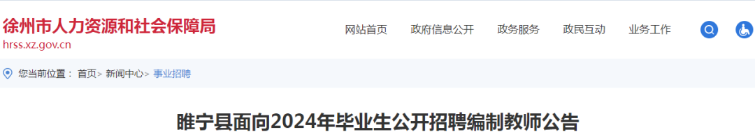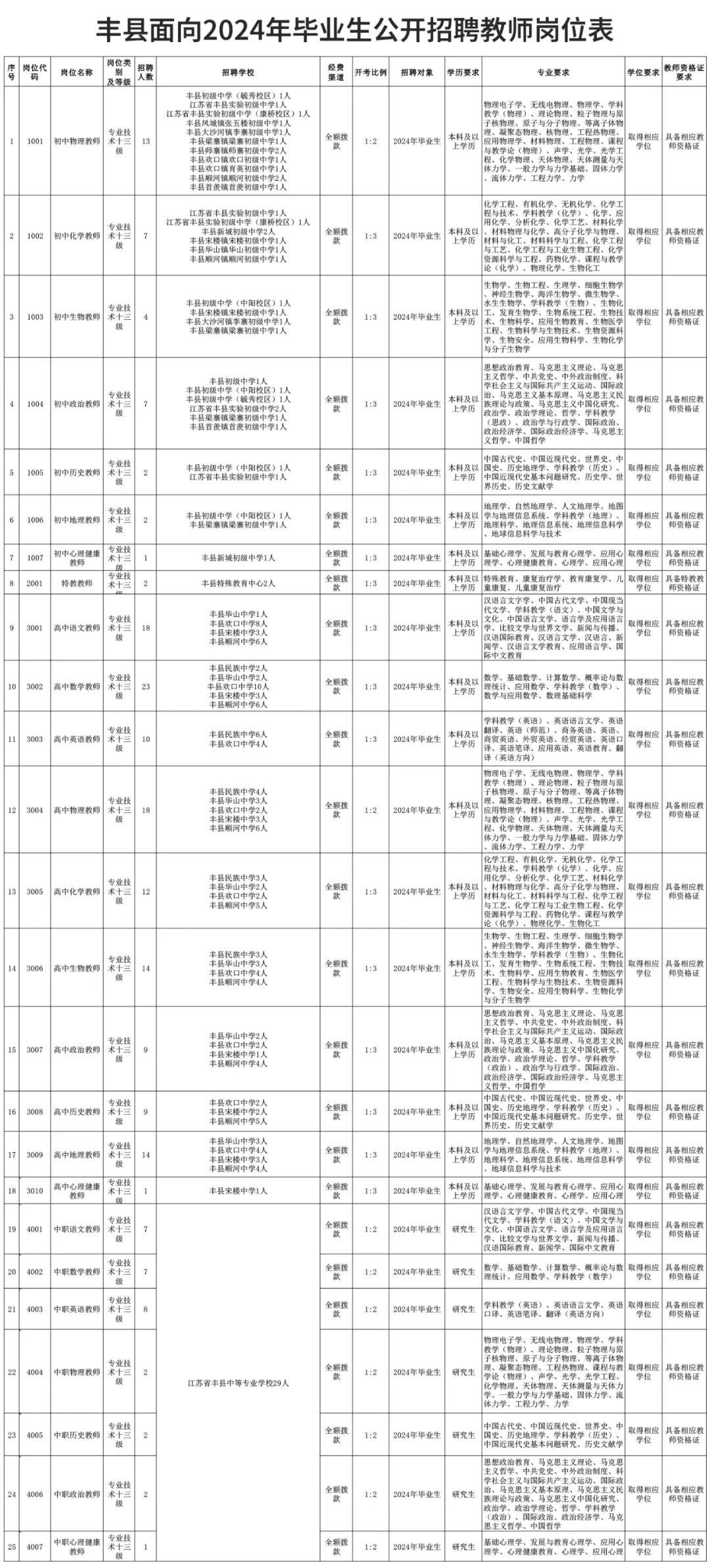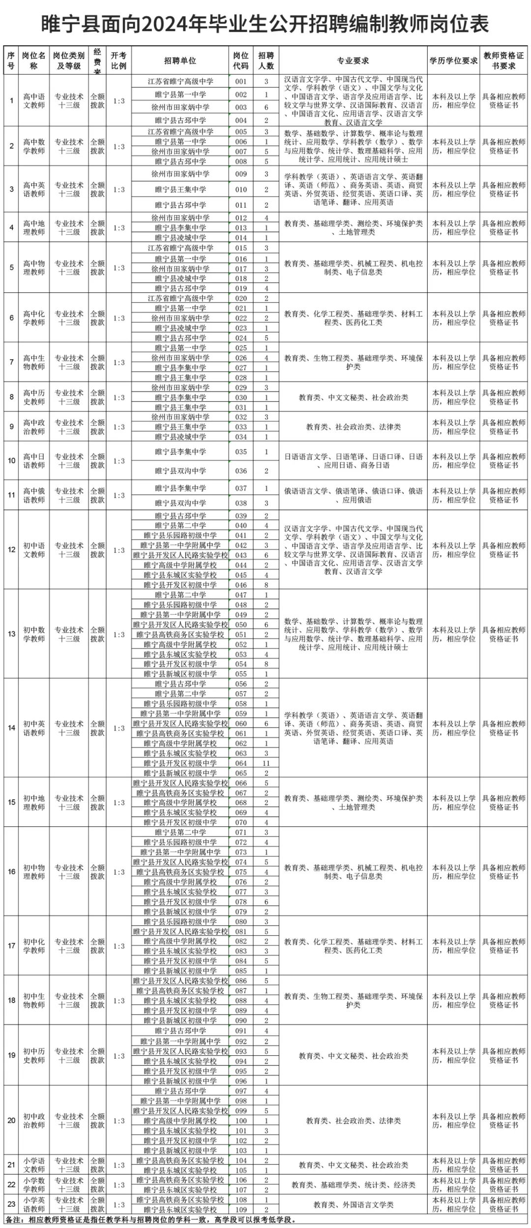 睢宁县面向2024年毕业生 公开招聘编制教师公告 (点击图片可放大查看) (上下滑动查看) ▼▼▼ 根据《事业单位人事管理条例》《江苏省事业单位公开招聘人员办法》等有关规定,结合睢宁县教育事业发展的需要,经研究决定,面向2024年毕业生公开招聘编制教师300名。现将有关事项公告如下: 一、招聘岗位 《睢宁县面向2024年毕业生公开招聘编制教师公告》在徐州市人力资源和社会保障网(http://hrss.xz.gov.cn)、中国睢宁门户网(http://www.cnsn.gov.cn/)和睢宁教育星空微信公众号(snjyxk)发布,具体的招聘单位、岗位名称、招聘人数、资格条件等详见《睢宁县面向2024年毕业生公开招聘编制教师岗位表》(以下简称《岗位表》)。 二、资格条件 (一)具有中华人民共和国国籍,遵守中华人民共和国宪法和法律,拥护中国共产党领导和社会主义制度。 (二)具备良好的品行和职业道德。 (三)具备正常履行岗位职责所需的身体条件和心理素质,热爱教育事业,具备教师的基本素质和教育教学能力。 (四)招聘对象为2024年毕业生(不含定向生、委培生)。 2022年和2023年普通高校毕业生,若仍未落实工作单位〔须满足以下条件:未与用人单位签订过劳动(聘用)合同或未存在过事实劳动关系,未曾以单位名义参加社会保险〕,其档案关系仍保留在原毕业学校,或保留在各级毕业生就业主管部门(毕业生就业指导服务中心)、人才交流服务机构和公共就业服务机构的,以及国(境)外同期毕业且已完成学历认证但仍未落实工作单位的人员,可应聘面向2024年毕业生岗位。 (五)符合相应的年龄、学历学位条件: 年龄在18周岁及以上、35周岁及以下(即1988年4月1日至2006年3月31日之间出生),博士研究生放宽至40周岁及以下(即1983年4月1日至2006年3月31日之间出生)。 具有本科及以上学历,并具有相应学位。国(境)外学历应聘人员,资格审核时须提供教育部留学服务中心出具的国(境)外学历学位认证证明。 (六)持有相应教师资格证书(2024年毕业生须2024年8月1日前取得相应的教师资格证书)。 (七)符合岗位要求的其他资格条件(详见《岗位表》)。资格条件中“专业”条件按《江苏省2024年度考试录用公务员专业参考目录》设置并审核。 (八)有下列情形之一的,不得报考: 1.现役军人或国民教育序列普通高校在读非2024届毕业生; 2.《事业单位人事管理回避规定》明确应当回避的岗位。 3.有《未成年人学校保护规定》等相关法律、法规或上级政策要求不得从事教师职业的情形。 三、招聘程序 (一)报名方式 本次公开招聘采取分时分站现场报名、现场资格审核、分站考试的方式,所有符合资格条件的人员均可报名应聘。符合资格条件的人员在每个站点只可报名应聘一个岗位,并参与该站点的考试。上一站招聘计划完成后,不再招聘同岗位人员,将在下一站继续招聘剩余空缺岗位,相关信息将提前通过“睢宁教育星空”微信公众号发布。 招聘工作组到有关高等院校进行招聘政策宣讲,并接受现场报名,所有符合资格条件的人员均可报名应聘,报名时间及地点: