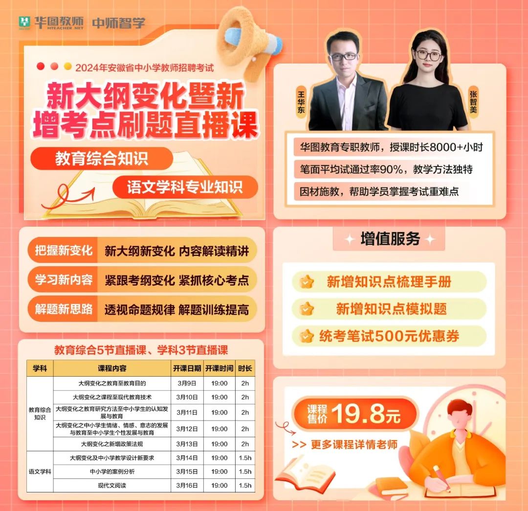 皖贵人的新大纲!真让人头疼! 不用慌,华图新大纲分析课来啦! 大纲详解+新题+课程优惠券 学科+教综两个科目,仅19.8元 带你一招制敌!统考无忧! 扫码回复【大纲】了解