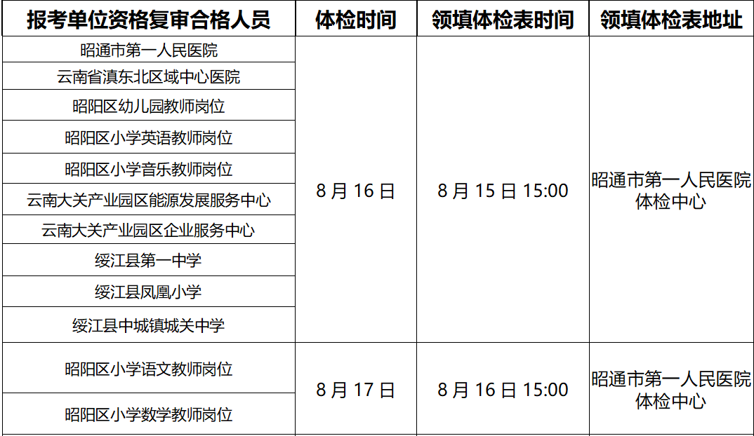 根据《昭通市2023年下半年事业单位公开招聘工作人员通告(第一号)》的有关规定,现将昭通市2023年下半年事业单位公开招聘工作人员笔试最低控制分数线、资格复审、面试、体检等有关事宜通告如下: 根据昭通市2023年下半年事业单位公开招聘工作人员各笔试专业类别参加考试人员笔试成绩情况,按照各笔试专业类别参加考试人员有效笔试成绩平均分的80%计算,昭通市2023年下半年事业单位公开招聘工作人员笔试最低控制分数线为:综合管理类81.75分、自然科学专技类77.51分、中小学教师类85.83分、医疗卫生类78.85分。笔试总成绩达不到最低控制分数线的应聘人员,将不能进入资格复审、体检、考察等环节。最低控制分数线以上人员名单见《昭通市2023年下半年事业单位公开招聘工作人员笔试最低控制分数线以上人员名单》(附件1)。按照《昭通市2023年下半年事业单位公开招聘工作人员通告(第一号)》的规定确定进入资格复审人员名单(不含免笔试岗位,免笔试岗位资格复审等事宜另行通知),具体见《昭通市2023年下半年事业单位公开招聘工作人员拟进入资格复审人员名单》(附件2)。时间:2023年8月14日至15日,上午:9:00—11:30,下午14:00—17:00;地点:昭通市市民之家就业和社会保障服务大厅一楼3号、4号窗口(昭通市昭阳区北部新区太平街道办事处锁营路285号,交通方式:市内可乘1路快线、16路、19路、46路公交车到达);咨询电话:0870-2121586、0870-2126819、0870-2124431。资格复审时需提供应聘人员身份证、户口簿、毕业证、准考证、《教育部学历证书电子注册备案表》《教育部学籍在线验证报告》《中国高等教育学位在线验证报告》《教育部国(境)外学历学位认证书》及其他与岗位要求相关的证件或证明材料的原件和一份复印件。资格复审须应聘人员亲自到场。报考岗位要求为中共党员(含中共预备党员)的应聘人员,在资格复审时还须提供所在党组织开具的证明材料。1.应聘人员要提前下载打印并填写《昭通市2023年下半年事业单位公开招聘工作人员资格审核表》(附件3)一式两份,资格复审时,上交审核人员审查。在审核过程中如有不符合报考岗位条件者,取消该应聘者的应聘资格。应聘者如有异议,可在资格复审期间向昭通市人力资源和社会保障局提出书面申诉。2.应聘人员必须在规定时间内携带相关资料到指定地点进行资格复审,逾期不到者,视为自动放弃资格复审;资格复审结束后,在体检、考察等环节若出现不合格者,将不再进行递补。对参加了资格复审且审核合格,后续程序再放弃的应聘人员,视为浪费考试资源,记入个人诚信档案。3.按照《昭通市2023年下半年事业单位公开招聘工作人员通告(第一号)》规定,应聘人员的资格审查贯穿公开招聘工作全过程,对在任何一个环节查出不符合通告要求的应聘人员,一律取消聘用资格。应聘者要对填报信息的真实性、准确性负责。凡提供虚假信息的应聘者,取消招聘资格;对伪造有关证件、材料,隐瞒信息、填报虚假信息骗取考录(聘)资格的,一经查实,取消招聘资格,并根据违规事实,依法依规追究责任,记入个人诚信档案。4.应聘人员应保持通讯畅通,手机号码如有变动,请主动与招聘部门(单位)联系,如因无法联系所造成的后果,由应聘人员自行负责。报考岗位需要加试的人员,待资格复审合格后,再组织面试加试。面试成绩满分为100分,最低控制线为70分,低于70分者不进入后续招聘环节。面试时间、地点等另行通知,请保持通讯畅通。资格复审合格且不需要面试的应聘人员,请于2023年8月16日至18日到昭通市第一人民医院体检,标准参照《公务员录用体检通用标准(试行)》及《公务员录用体检操作手册(试行)》进行,有行业体检标准的按行业体检标准执行。体检时携带本人身份证,体检费用320元由应聘人员自付。体检前先到体检医院填写体检表,填写体检表时请携带身份证、准考证和一张近期免冠小一寸照片。体检前1至2天,不吃油腻食物、不喝酒,体检当天早上空腹、憋尿。具体体检时间见下表。