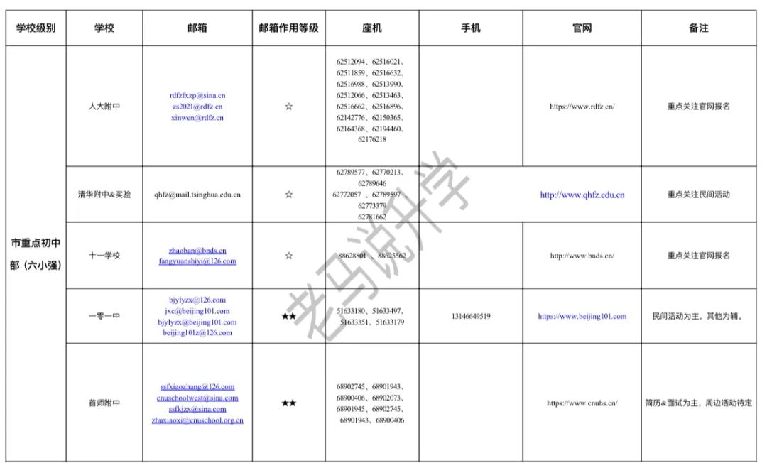 解决育儿难题 助力缓解教育焦虑 提供实用的择校技巧 你身边接地气的升学顾问 这两天海淀不少学校评选出了市三好,进度比去年要快,目前六年级丰富简历的机会很少了,所以简历几乎定型。 每一届家长都会有一个很困惑的问题,就是给学校邮箱发简历,这个事儿有没有用? 根据个人经验以及历届家长的经历,网学校发送邮件这件事儿,对于少数学校有效,对于大多数学校,无效。 最有用的,是学校开放日公布了“咨询”邮箱,疫情消退后部分学校恢复了开放日,这对学校和家长是双赢,可以相互深入了解。 客观讲,开放日看到的大概率是学校好的那一面,就和相亲似的,怎么也得打扮打扮,把最好的一面展示给对方。 硬件设施出众的,就更容易占得先机,而单依靠软件著称的多数都不开放,甚至不用开放。 原则上,目前还是有点早,学校普遍还没有启动官方招生,4月份可能有些学校就按捺不住,5月份会到达高峰,6月份逐步首位,择校结束,7月初大派位,都给安排个去处。 邮箱发简历,实际上重复投递的必要性不大,因为重复看一个人的信息,确实有些耽误事,邮箱收集数据本身效率就很低。 作为“朝廷”没人,没有特殊通道的家长,靠自己发简历也算是一种方式让学校看到孩子,重要的不是发送了多少次,而是学校什么时候看(shai)邮(jian)箱(li)更为关键,正是筛选的时候给发一份,那肯定是最有效的。 即便是海投,也需要有所侧重,西城和朝阳有点空间的学校,可以积极些投递,海淀区这边以下几所可以对邮箱重视些。 人分 rdfzfxzs2020@vip.163.com 建华 jianhuaxuexiao@126.com bjjhsyxxb@163.com bjjhzxb@163.com jianhuasxd@163.com 民大附中 mdfzsyx@126.com mdfzsy@126.com 理工附中分校 lgfxzb@163.com lgfxzb1@163.com lgfxzb2@163.com 海外 zhongxue@bjfles.com hw_job@vip.126.com 锦秋 zhaosheng@bjjqschool.cn office@bjjqschool.cn 上地实验 shd101bgs@163.com shd-101@126.com 首北 ssdfzbxq@vip.163.com ssdfzbxq@126.com 首师大一分 cnuschoolwest@sina.com 人西 rdfzxishan@rdfz.cn 57中 good57tuanwei@126.com wsqzs2021@126.com 人翠 rdfzcwxx@rdfzcw.cn 101双榆树 shuangyuxq@beijing101.com 101温泉 174106543@qq.com 101矿大 bj101zkdfx@126.com 首师大玉泉 yqxxsx@163.com 交大附中东校区 jdfzdxq@yeah.net 小强下面这俩可能还有点用? 101中 bjylyzx@126.com jxc@beijing101.com bjylyzx@beijing101.com beijing101z@126.com SSF ssfxiaozhang@126.com cnuschoolwest@sina.com ssfkjzx@sina.com zhuxiaoxi@cnuschool.org.cn 对于邮箱作用评级、联系电话以及关于学校重点关注的点,我也整理了一下,分享给大家。 ![]() 需要的家长可以添加下方助理索取,暗号“快,给我表格”。 简历的作用相对小了,尤其对小强,单纯靠简历进入的概率在逐年走低,2024届简历作用只会更低,集团内选拔是一种补充,但不是全部。 对于非毕业年级的小学生群体,如果完全放弃丰富简历,是否行得通,需要2024届来趟趟路,如果真有这么一天,未必是坏事。 让迷茫者有方向,让有方向者有力量,我是马德辉,孩子升学路上的陪伴者。 马老师(2011年入行)= 老马说升学(2016年开始运营)= 马老(2017届家长的称呼)= 马舅舅(2019届家长的叫法)= 马德辉 为防失联,可尽早建立深度沟通,截图并扫码即可添加下方助理可进入马老师微信群,暗号“马舅舅介绍来的”。 由于微信平台改版,公号内容将不再以时间排序展示,如果大家想第一时间看到推送,建议星标本公众号,星标具体步骤为在本公众号主页点击右上角的三个点,在弹出页面点击“设为星标”即可。 ![]() |