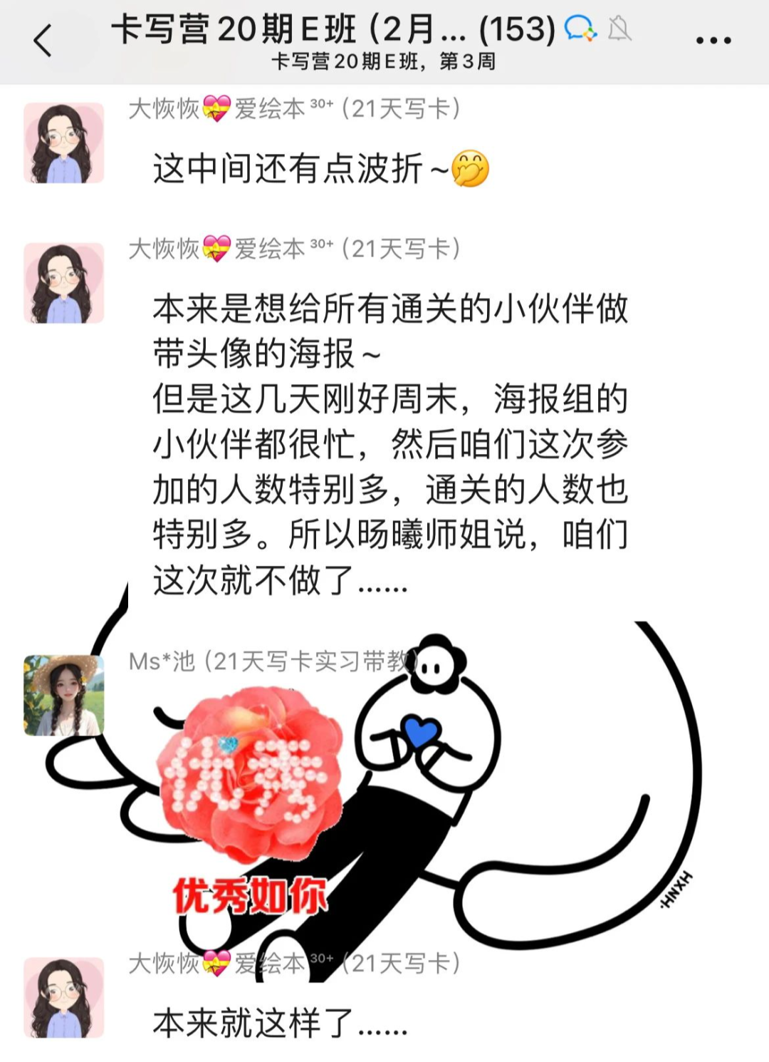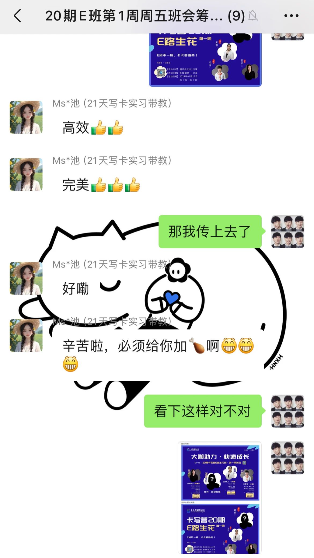 2024-2-29日收到20期E班(古典老师21天卡写营)的带教 - 旸曦师姐的邀请,成为了21期D班的实习带教。