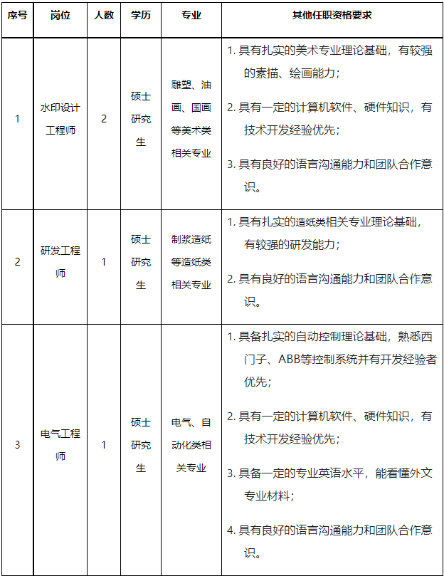 2.拥护中华人民共和国宪法,拥护中国共产党领导和社会主义制度,有良好的政治素质和道德品行,志愿投身和服务于印钞造币事业;3. 具有全日制硕士研究生及以上学历,2024年应届毕业生,年龄在28 周岁以下(1996 年1月1日以后出生);报名提供材料:①工作职位申请表(附件1);②以下学历证明材料之一:毕业证扫描件,教育部学信网学籍学历查询报告扫描件,留学生应提供教育部留学服务中心出具的学历学位认证书扫描件,其他有效证明材料。报名时间:从本公告发布之日起至2024年3月15日。在线投递:请将上述材料以邮寄附件方式发送至:ksczhr@126.com,邮件名称格式:岗位-专业-学历-姓名。邮寄投递:江苏省昆山市震川东路1188号昆山钞票纸业有限公司人力资源部(收),邮编:215300。请注明:“应聘简历”,申请材料恕不退还。