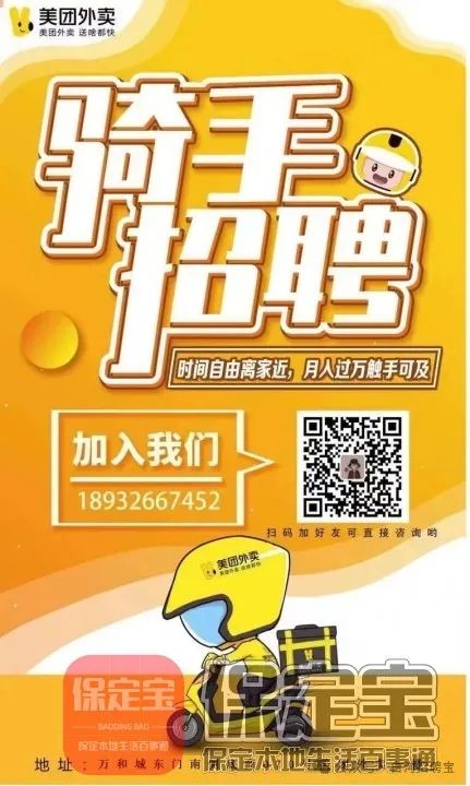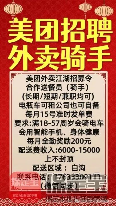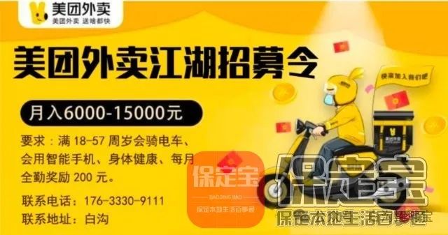 岗位详情:会骑电动车,负责白沟区域内的餐品配送,工作简单自由,公司可提供车辆,餐箱,工服,头盔,保险,轻松月收入 7000-15000,年龄18-55周岁,男女不限,全职兼职都可以,有专人带,不用怕不会。每个月15号准时发工资。