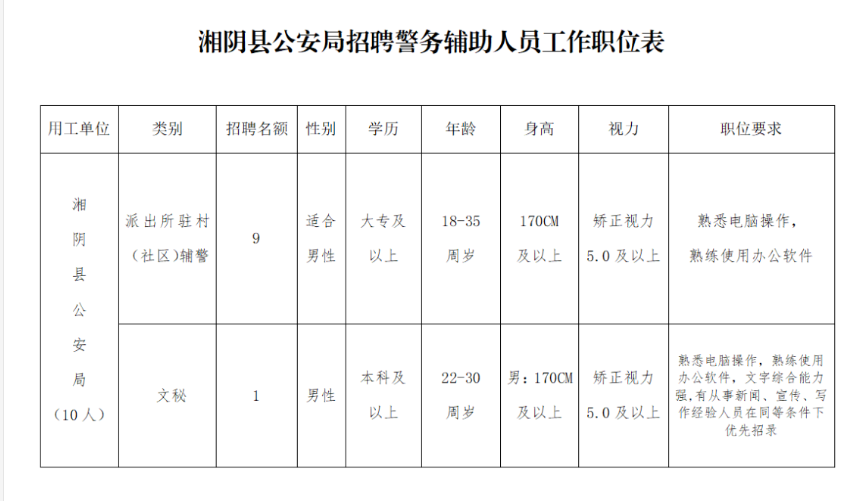 本次计划招聘辅警10人,具体招聘职位、人数、资格条件等详见《湘阴县公安局招聘警务辅助人员工作职位表》。根据报名人数适时调整招聘计划。