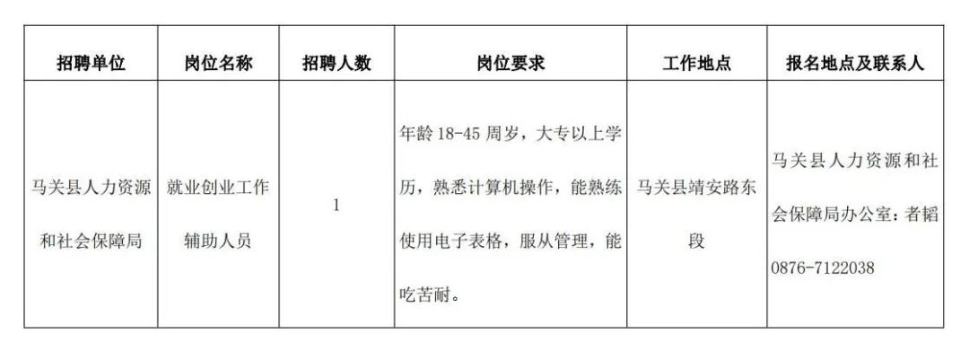 根据《云南省人力资源和社会保障厅云南省财政厅关于进一步做好公益性岗位开发管理有关工作的通知》(云人社发)〔2020〕9号)规定,现将马关县人力资源和社会保障局城镇公益性岗位工作人员招聘有关事宜公告如下: