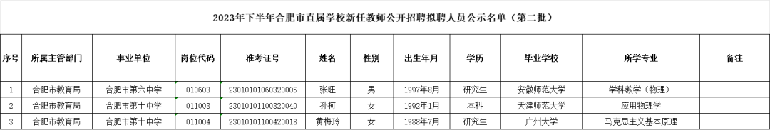根据《2023年下半年合肥市直属学校新任教师公开招聘公告》,经过资格审查、笔试、面试、体检、考察等程序,现将拟聘人员张旺等3名同志进行公示,公示期7天(2024年3月5日- 2024年3月11日)。如对上述拟聘人员有异议,请以书面形式向市纪委监委驻市教育局纪检监察组或市教育局组织人事处提出。