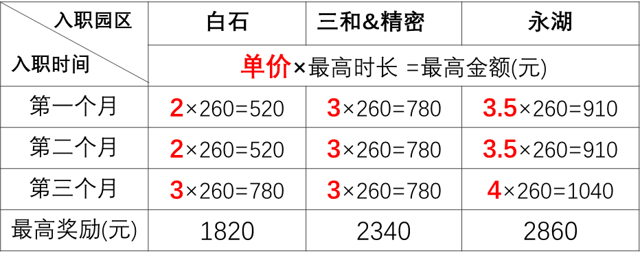 2.薪资构成=底薪+加班费+工种补贴+超产奖金+工龄补助; 4.加班费:如按底薪2360-3510元/月为基数计算:◆平时加班按1.5倍:20.35-30.25元/小时;◆周末加班按2倍:27.13-40.34元/小时;◆法定节假日按3倍:40.69-60.51元/小时; 5.工种津贴:大部分工种享有100-550元/月不等 (计加班费用后可达180-1000元/月);6.工龄补助:入职享有100-600元/月(计加班费用后可达180-1200元/月); 7.超产奖励:大部分岗位每月享有100-1000元不等; 8.新入职员工生活补贴:当月入职一次性补贴200元/人(含就餐补贴、新入职体检返还费用)。● 饭卡预充:每月预充值500元(先吃后扣);