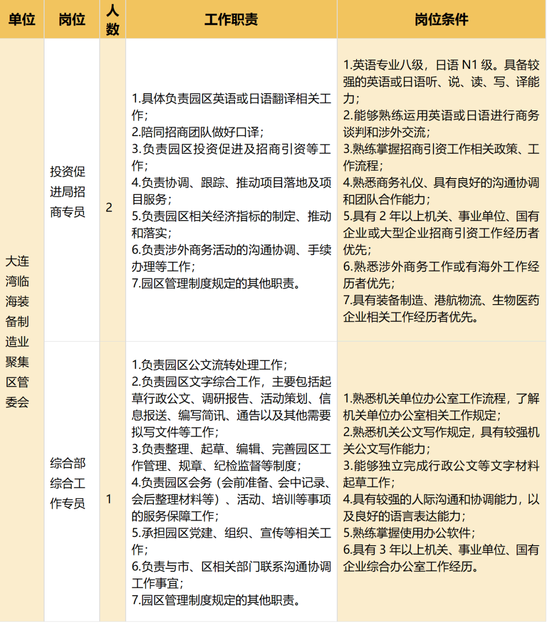为推动大连湾临海装备制造业聚集区(以下简称园区)事业发展,园区结合岗位需求,根据《大连市园区干部人事制度和薪酬制度改革指导意见》《大连市园区新进人员工作指导意见》规定,采用公开招聘方式面向社会招聘新进工作人员,现就有关事项公告如下:
